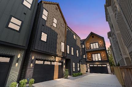 Delta Homes introduces a stunning Scandinavian-inspired community in Shady Acres, setting a higher standard for everyday living with three unique residences. Designed by Viarq Designers and built with Delta’s signature quality, these homes showcase two-story covered balconies and thoughtful floor plans. Starting with the middle interior unit, the first floor offers a spacious bedroom with full bath, while the second floor is devoted to living—soaring ceilings, sleek European flat cabinets in two-tone black lacquer and warm wood, Bosch appliances, a dining area with wet bar, and a living room opening to a private balcony. The third-floor primary suite features cathedral ceilings and a resort-like bath with oversized dual vanities, soaking tub, seamless floor-to-shower transition, frameless walk-in shower, and a custom-shelved walk-in closet. Blending design and craftsmanship, this enclave reflects Scandinavian elegance tailored to modern Houston living.