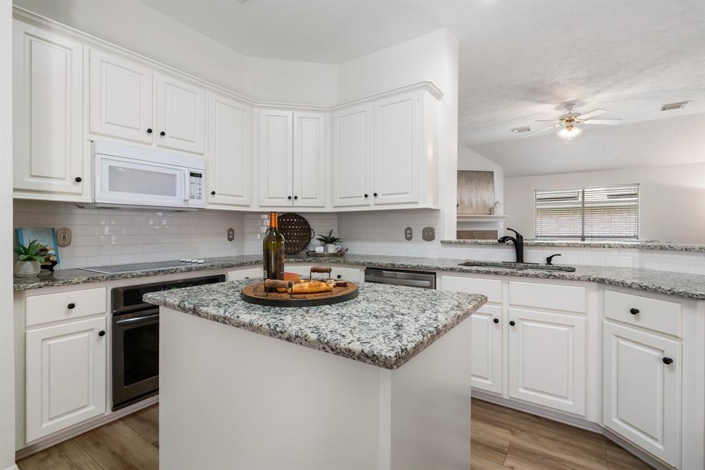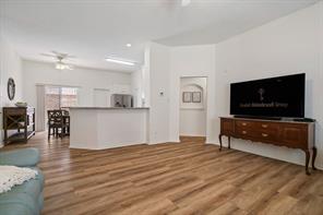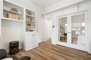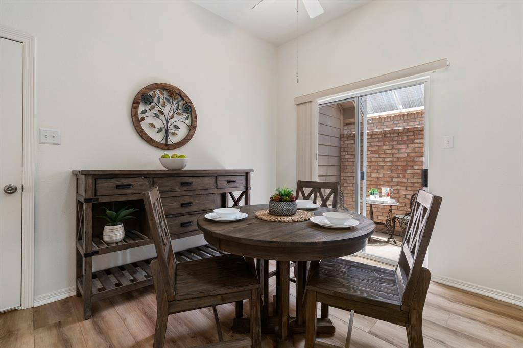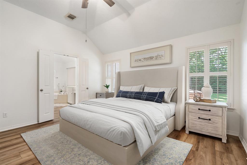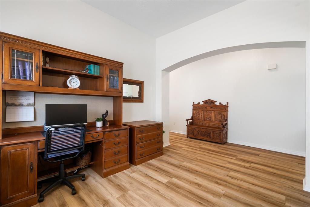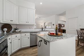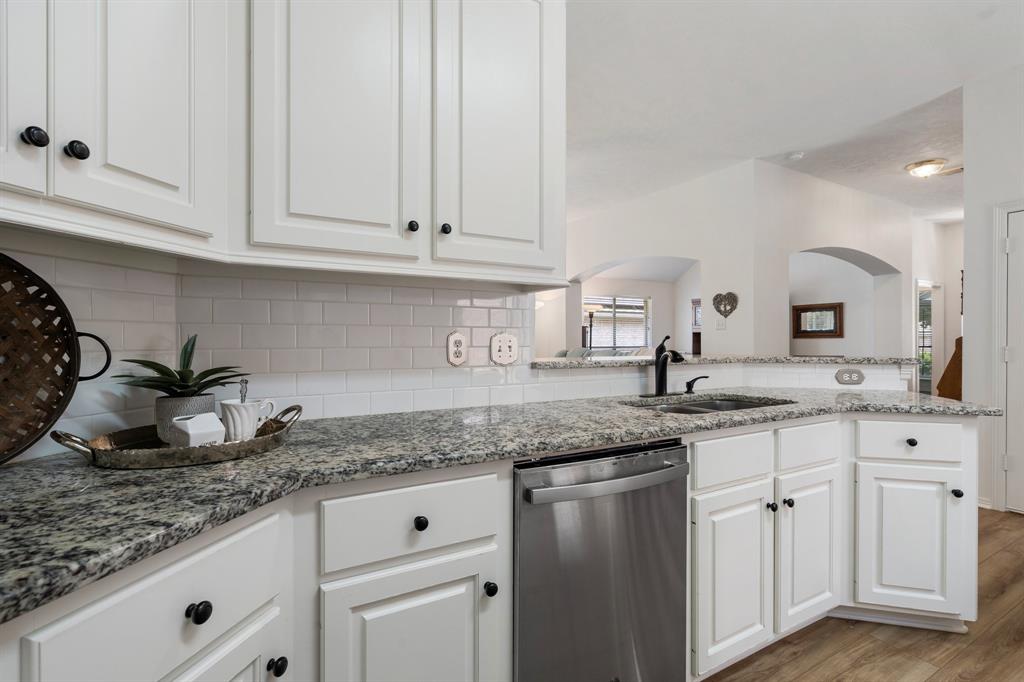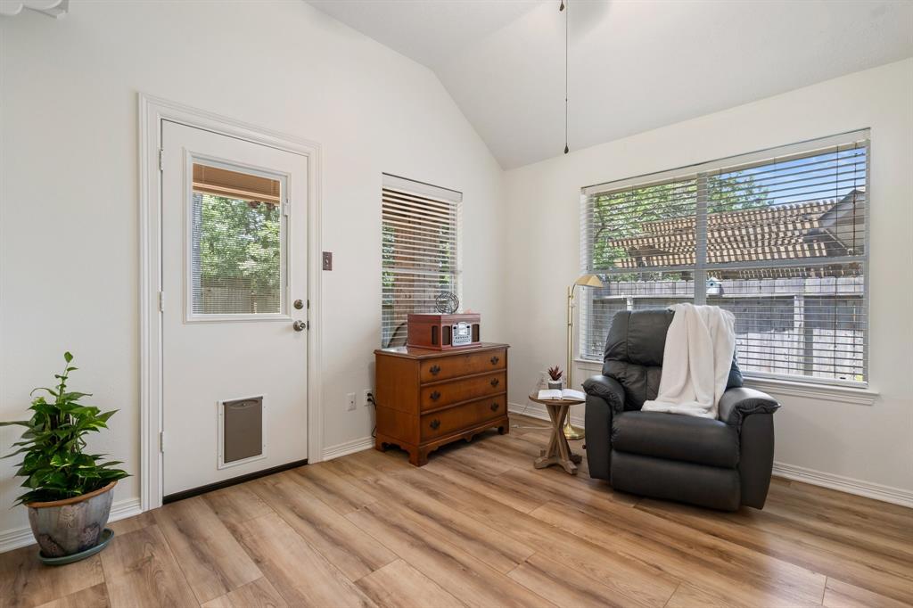 Discover refined living in this 2-bedroom, 2-bathroom patio home, where recent vinyl plank flooring flows throughout. The formal entryway features high ceilings, windows are a defining feature, bathing every room with natural light. A dedicated study, complete with custom built-in shelving, provides the ideal flexible space. The kitchen is a chef's delight, boasting a generous island with stunning granite countertops, classic shaker cabinets and sleek stainless steel appliances. This well-designed space offers ample storage and counter space. Retreat to the luxurious primary suite, featuring double sinks, vanity space, a large soaking tub, and a separate walk-in shower. The secondary bedroom is equally inviting, with an arched window. A utility room is located inside the home. Step outside to a spacious green backyard featuring a cobblestone pathway and covered patio lined with mature landscaping. Don’t miss the opportunity to make this gem your own!