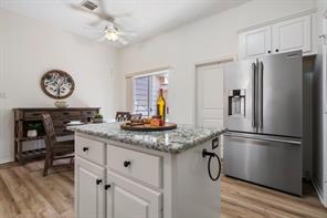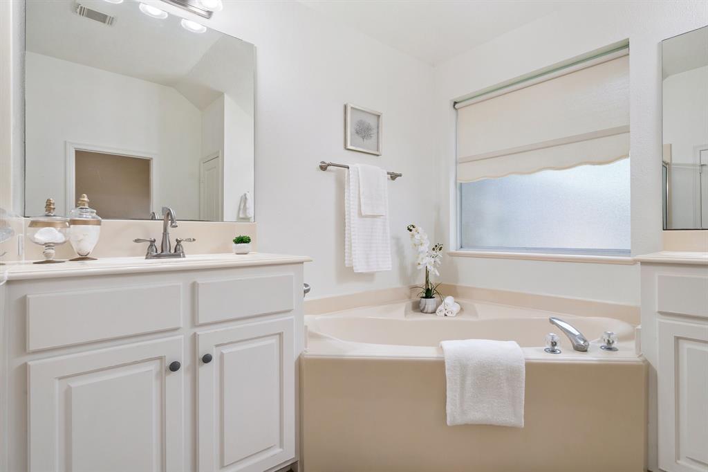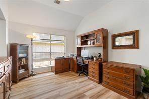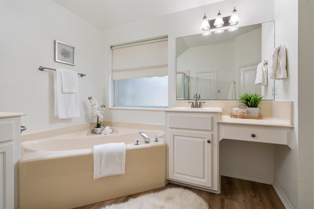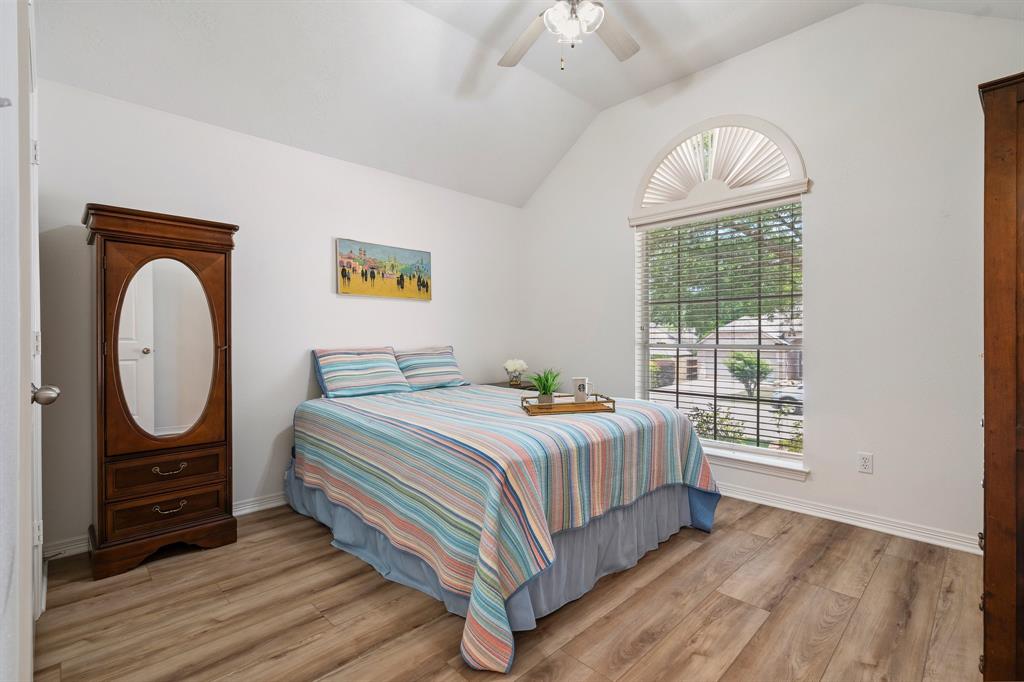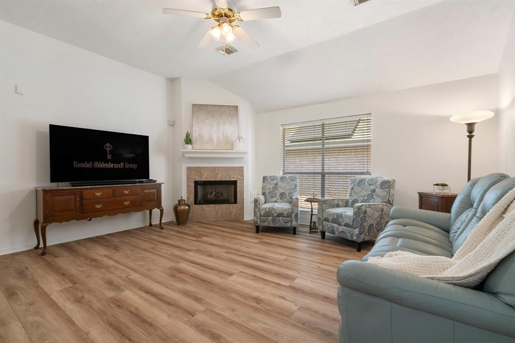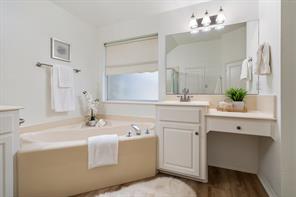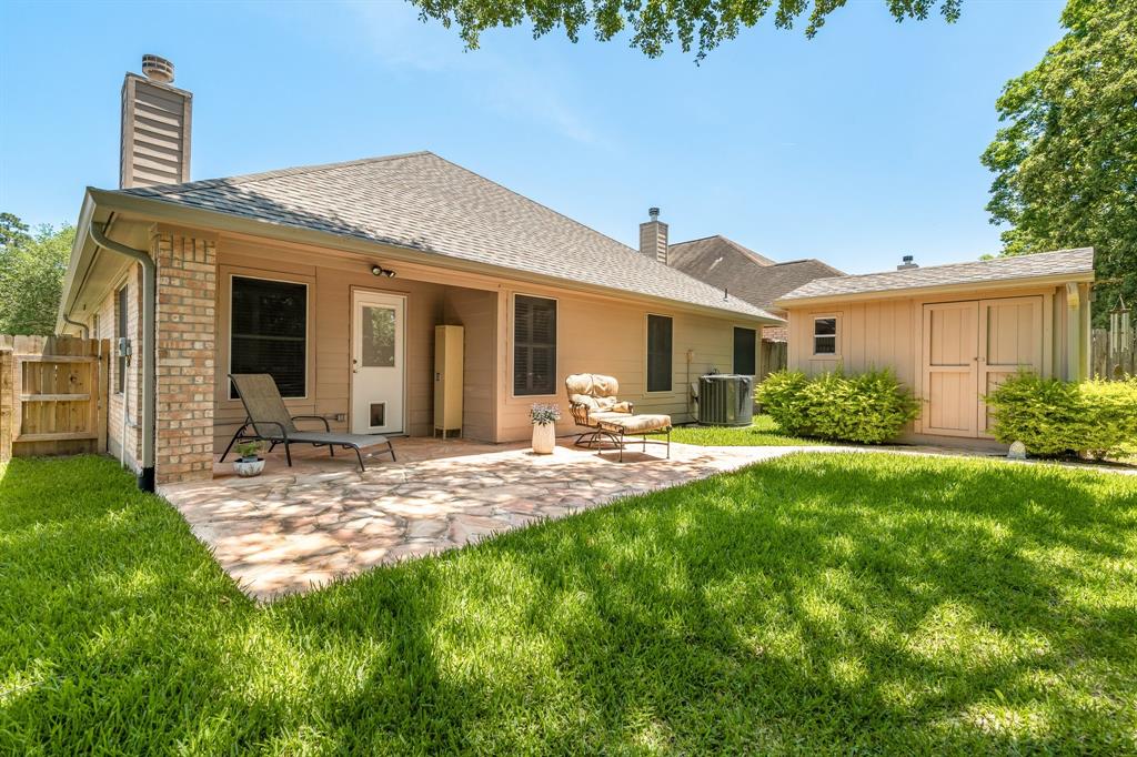 Discover refined living in this 2-bedroom, 2-bathroom patio home, where recent vinyl plank flooring flows throughout. The formal entryway features high ceilings, windows are a defining feature, bathing every room with natural light. A dedicated study, complete with custom built-in shelving, provides the ideal flexible space. The kitchen is a chef's delight, boasting a generous island with stunning granite countertops, classic shaker cabinets and sleek stainless steel appliances. This well-designed space offers ample storage and counter space. Retreat to the luxurious primary suite, featuring double sinks, vanity space, a large soaking tub, and a separate walk-in shower. The secondary bedroom is equally inviting, with an arched window. A utility room is located inside the home. Step outside to a spacious green backyard featuring a cobblestone pathway and covered patio lined with mature landscaping. Don’t miss the opportunity to make this gem your own!