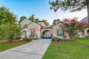 Breathtaking two story home with a porte-cochere built by Highland Homes on a huge corner lot in Woodforest! Open concept kitchen and living-room with engineered wood floors, soaring ceilings with exposed wood beams give this beautiful home a rustic flare. Chef's kitchen is simply outstanding with easy access to formal dining, granite countertops, designer light fixtures, double crown molding, a huge island and custom cabinetry. Spa like primary bedroom on the first floor with a large walk-in closet, separate shower and bathtub is impressive with high quality finishes and attention to detail. All bedrooms with its own full bath. On second floor, a bar area with sink and wine cooler is conveniently located between game and media rooms. Stone fireplaces in living-room and patio! Backyard with outside restroom and sprinkler system has space for a pool! Enjoy golf at Woodforest Golf Course, tennis, walking trails and community pool. Short drives to The Woodlands, Magnolia and Lake Conroe.