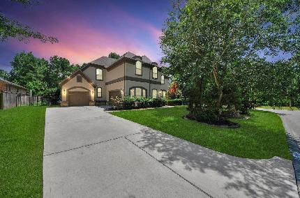 Breathtaking two story home with a porte-cochere built by Highland Homes on a huge corner lot in Woodforest! Open concept kitchen and living-room with engineered wood floors, soaring ceilings with exposed wood beams give this beautiful home a rustic flare. Chef's kitchen is simply outstanding with easy access to formal dining, granite countertops, designer light fixtures, double crown molding, a huge island and custom cabinetry. Spa like primary bedroom on the first floor with a large walk-in closet, separate shower and bathtub is impressive with high quality finishes and attention to detail. All bedrooms with its own full bath. On second floor, a bar area with sink and wine cooler is conveniently located between game and media rooms. Stone fireplaces in living-room and patio! Backyard with outside restroom and sprinkler system has space for a pool! Enjoy golf at Woodforest Golf Course, tennis, walking trails and community pool. Short drives to The Woodlands, Magnolia and Lake Conroe.