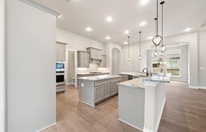 1½-story home features an elegant oval entry with 13' ceilings that open to the formal living room. The extended entry with a 21' ceiling is flanked by formal dining room on one side and kitchen on the opposite side. The kitchen is central to the home and open to the dining room, breakfast room and family room. It features a large island with high bar, 42" cabinets, stainless steel built-in microwave and oven, 36” cooktop, and dishwasher. The large 18'x21' family room features a 14' ceiling, electric fireplace, and large wall of windows. The master bath includes a freestanding tub, separate shower and His and Hers vanities. Located upstairs is a game room, media room, and ½ bath. Home sits on a lot with no back neighbors and a waterfront view.