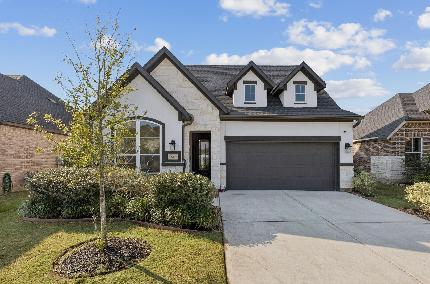 Spectacular 1.5-story home with serene water views in the Yaupon Trails community! This stunning residence offers 3 beds, 3.5 baths, a home office, an upstairs game room, an oversized 3-car garage, and much more. Welcoming entry opens to the spacious home office, complete with beautiful water views. Chef's dream kitchen boasts elegant granite countertops, abundant cabinetry, a massive island with breakfast bar seating, a walk-in pantry, and a cozy breakfast nook. Kitchen flows seamlessly into the living room with soaring ceilings and backyard views. Secondary bedrooms are generously sized with great closet space. Secluded primary suite presents high ceilings, backyard views, and a luxurious en suite bath. The spa-like primary bathroom showcases dual vanities, a glass-enclosed shower, a soaking tub, and a huge walk-in closet. Enjoy outdoor living at its best with a covered patio, green space, and the added privacy of no backyard neighbors. This home is truly a rare find!