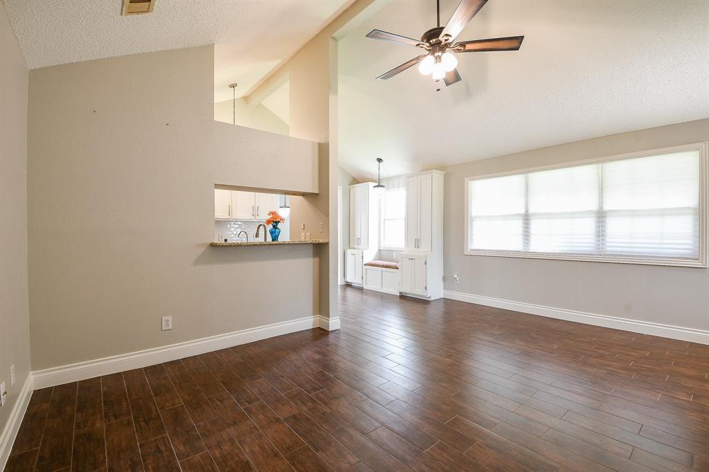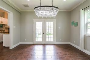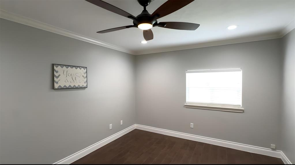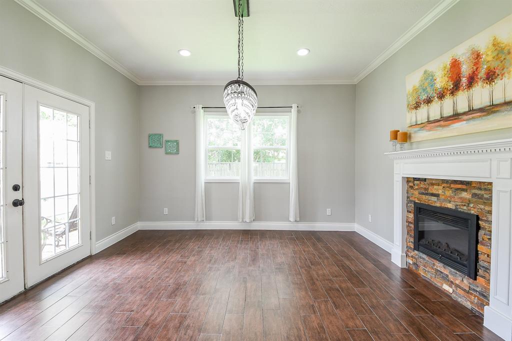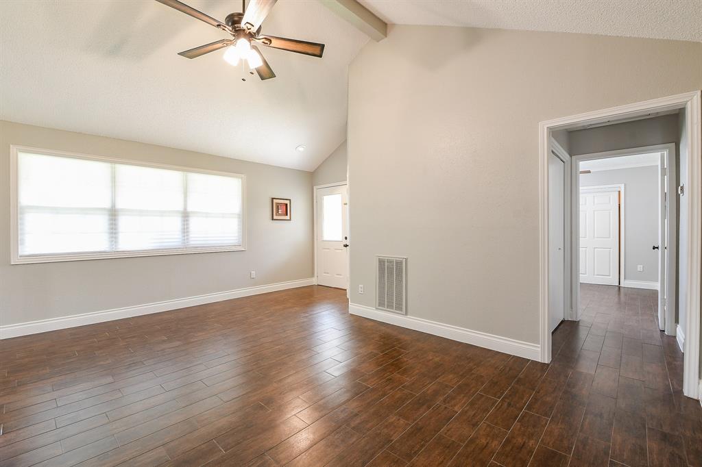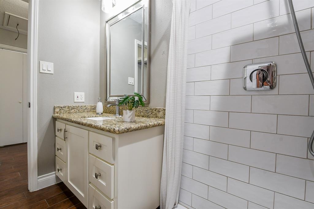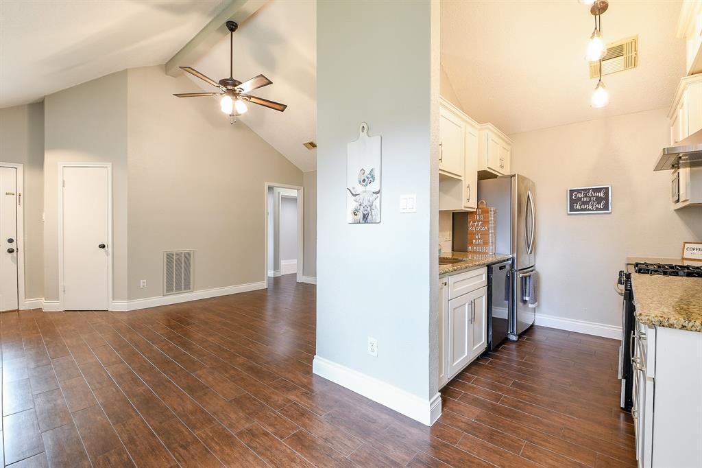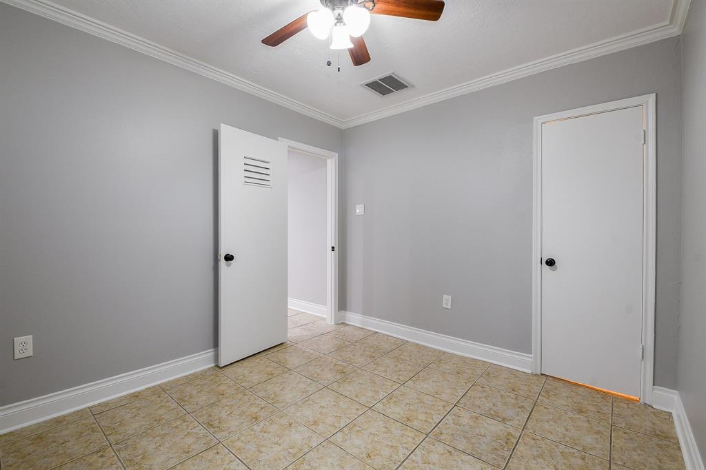 Welcome to this beautiful 3-bed, 1-bath home! As you approach the front door, you are greeted by a lovely covered porch. Inside, stylish wood-look tile flooring flows throughout the home. Vaulted ceilings in the kitchen and the living room. Kitchen boasts ample storage with beautiful white cabs, granite counters, refrigerator and SS appliances. Cozy, convenient window seat by the kitchen. Added formal dining room features a brick fireplace, a chandelier, recessed lighting & French doors to the backyard. All bedrooms feature a ceiling fan. Garage has been thoughtfully converted into a 3rd bed & an additional versatile room ideal for an office/study/kids room! The bathroom has granite counters and a beautiful tiled standing shower. Primary bed is located in the back. Step outside to the backyard with a large shed and a covered deck. Conveniently located at Beltway 8 E and I-45 S. Schedule your tour today!