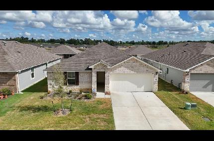 Beautiful one-story home in the quiet, prestigious Rockbridge community just outside Huntsville, TX. Enjoy a country feel with quick access to shopping, restaurants, top-rated schools, and a short drive to Houston. This DR Horton Texas Cali floor plan offers 4 bedrooms, 2 full baths, and a 2-car garage. The open-concept layout features vinyl plank flooring throughout—no carpet! The kitchen and breakfast area flow into a spacious living room. The primary suite includes a large walk-in closet and private bath. Three additional bedrooms provide space for guests or a home office. Upgrades include full-house gutters and a French drain for added convenience. Relax on the covered patio and enjoy one of the largest corner lots in the neighborhood. A perfect blend of comfort and style—Book your tour today!