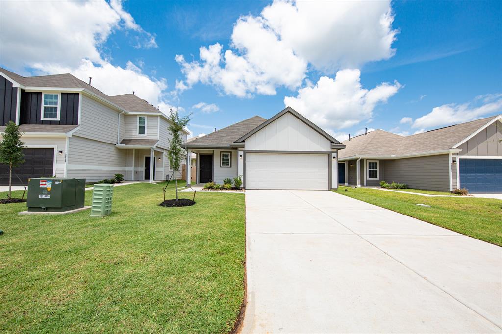 Love where you live in River's Edge in Conroe, TX! Home is zoned to the excellent Woodlands schools Buckalew Elementary School, Mitchell Intermediate School, McCullough Junior High School, and Woodlands High School. The Wildflower floor plan is a charming 1-story home with 4 bedrooms, 2 bathrooms, and a 2-car garage. This home has it all, including privacy blinds and vinyl plank flooring throughout the entire home! The gourmet kitchen is open to both the dining and family rooms and features 42" cabinets, granite countertops, and stainless-steel appliances! Retreat to the Owner's Suite featuring double sinks with granite countertops, a separate tub and shower, and a walk-in closet. Enjoy the great outdoors with a sprinkler system and a covered patio! Don't miss your opportunity to call River's Edge home, schedule a visit today!