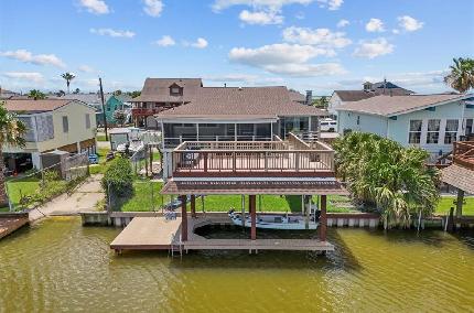 An adorable East facing three bedroom home in Bayou Vista with Open kitchen, living, and dining areas. Complete living quarters up and down. A boat house and lift ready for fishing boat bringing your fishing poles and crab traps. A lift to get your groceries and personal items upstairs. Community pool and playground. Per seller, the house has Flood Insurance until August 31, 2027 and transferable.