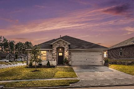 Stunning and move-in ready home located on a quiet cul-de-sac in Rivers Edge! With easy access to I-45, amenities include walking trails, a community pool, pavilion and playground. Some of this home's highlights include luxury vinyl plank wood-look flooring, neutral paint for an easy transition, neutral carpet in the bedrooms, granite counters in the kitchen and baths, and abundant windows that bathe the home in natural light. The open concept island kitchen with gas range, stainless steel appliances, tons of counter space and cabinet/drawer storage overlooks the dining room and den. Refrigerator, Washer & Dryer are all included. Spacious primary bedroom downstairs; three bedrooms and a game room up; two car attached garage; fenced yard features a covered patio and a whole-home generator for peace of mind!