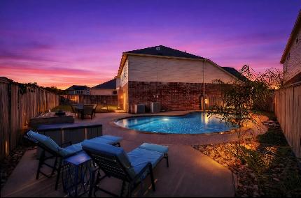 Beautiful large 5 bedroom, 3.5 bathroom home located on an oversized cul-de-sac lot. Tall ceilings await you as you enter, with two staircases & lots of living areas. A spacious primary bedroom with a sitting area overlooks the backyard. The 1st floor has high-end custom wood flooring; The upgraded Primary bathroom has his/her vanities, tub, plus a separate all-glass shower & walk-in closet. A lovely chef's kitchen with a large island & pantry with custom pull-out drawers! The primary bedroom & den have new thermopane windows. 4 bedrooms along w/a game room & study are located upstairs. The game room has custom, built-in cabinets & study has French doors; The upstairs bathrooms have all been updated. The oversized tranquil backyard has a pond w/babbling waterfall & tool shed! Beautiful extended covered patio & outdoor kitchen w/granite counters, gas grill & slate flooring. Great location within a few steps to the neighborhood amenities. Never flooded!