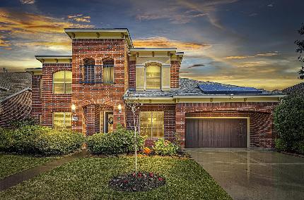 Custom 1.5-story home in gated lake community! Located on a corner lot, this Mediterranean/Traditional home offers 3–4 bedrooms, 3 full baths, and 2 half baths. Elegant entry with lighted dome ceiling & travertine floors leads to a grand dining room and private study rich with character, built-ins, and wood flooring. The living room boasts coffered beams, a stone fireplace & plantation shutters, while the gourmet kitchen is equipped with high-end appliances, granite countertops, and custom cabinetry. The spacious primary suite has a luxurious bath & oversized closet (3rd-level pull-down racks). Upstairs features a spacious game/media room (opt 4th bedroom) and exterior includes yard w/ large wraparound covered patio. Enjoy a gated community with paths around two lakes, min. from Vintage Park & Kickerillo–Mischer Preserve. HOA includes mowing & trimming of front and backyard. AC Units 2024, Tankless Waterheater 2022, Flooring 2022, Epoxy Garage 2022, and 2 Garage Door Openers 2022.