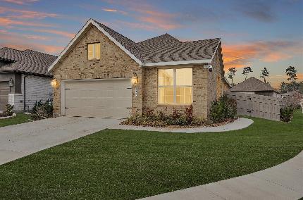 Built by Highland Homes, this charming all-brick, one-story residence offers an inviting blend of comfort and modern convenience. The stylish kitchen boasts granite countertops, stainless steel appliances, and cabinet door pulls. Wood-look floors enhance the main areas, while plush carpet adds warmth to the bedrooms. Included washer, dryer, refrigerator, and energy-efficient tankless water heaters add convenience. The primary suite features a bay window and a luxurious bath with a separate shower and soaking tub walk in closet and his and hers sink. The extended outdoor living area is perfect for relaxation, with a sprinkler system keeping the lawn pristine. Nestled in a vibrant master-planned community of Artavia, Montgomery County/Conroe, TX Area north of Houston, residents enjoy scenic walking trails, a serene 5-acre lake, and an exclusive clubhouse. Quality craftsmanship & thoughtful details make this home a perfect blend of style and functionality.