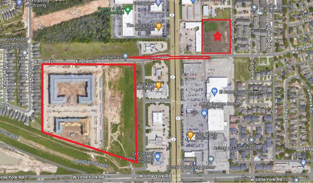 PRIME LOCATION!!!! HWY 6 , FM 529, WEST LITTLE YORK. BUSY AND DEVELOPING AREA. MASSIVE upscale apartment complex construction is just across the traffic light at Hwy-6 and Kingfield Dr., minutes from the property. Property Currently zoned for Commercial use and can be converted to Residential or Multi-Purpose use. Property good for Professional Office Building, Shopping Strip, Restaurant, Mini Condo, Town Homes, Apartments, Hotel / Motel etc. SELLER ALREADY PAID TO REMOVES TREE, LEVEL THE GROUND AND ADD SELECT FILL. Recorded survey plat and ready to build. All utilities are ready. Topography survey is available