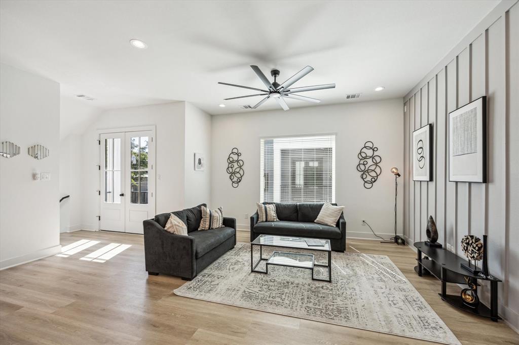 Arcada Homes, known for innovative design and meticulous execution, presents The Villas at West 23rd—seven modern urban retreats in the heart of Shady Acres. This inner home showcases a striking two-toned Hardie exterior in peppercorn gray and pure white. Inside, Dakota Oak LVP flooring flows throughout, with no carpet in sight. The first-floor bedroom features an ensuite bath and a spacious closet for privacy and comfort. The second level impresses with 10ft ceilings, an open living area that merges seamlessly with a chef’s kitchen that features two-toned cabinetry, black hardware, and a quartz island with ample storage. The third floor hosts a sizable flex space suitable for a great office area, a sunlit primary suite with oversized windows and a sleek ensuite bath, plus a large secondary bedroom alongside a side-by-side W/D utility room.
