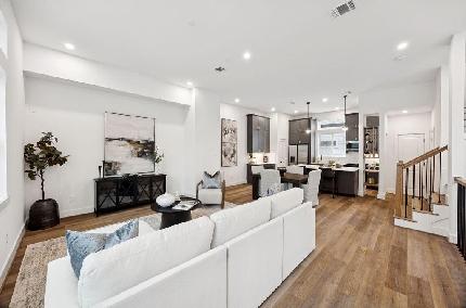 Wonderful 3 bedroom, 3 1/2 bath home on a corner lot in the gated community of Knoll Park in Spring Branch! Home features wood flooring throughout common areas, crown molding, and wrought iron stair spindles! First floor bedroom with full bath. Second floor living room, kitchen and dining! Open concept is perfect for entertaining. Kitchen with gray cabinets, quartz countertops, tile backsplash, under mount sink, a center island & stainless steel appliances! Covered balcony off of the living and kitchen area! The primary suite along with another bedroom is located on the third floor. Primary suite has a large bath with vaulted ceilings, dual sinks, a spa tub and separate shower. Close to shopping & restaurants. Community dog park, controlled access gates, guest parking, fountains and plenty of green space! Spring Branch ISD!