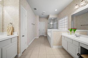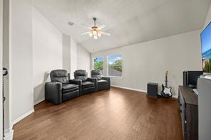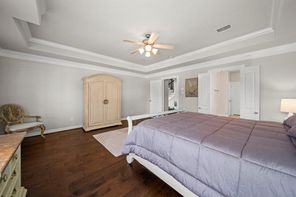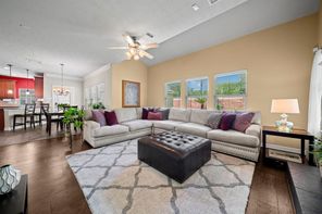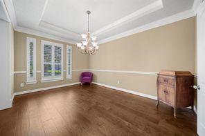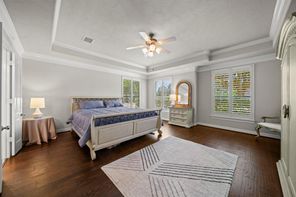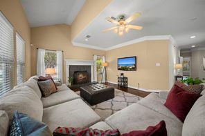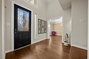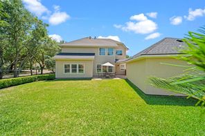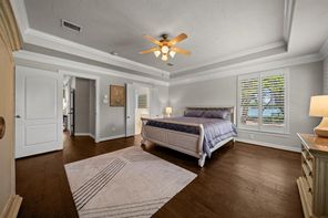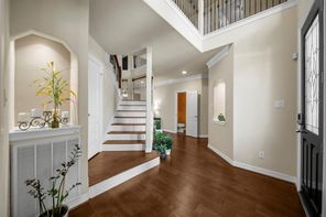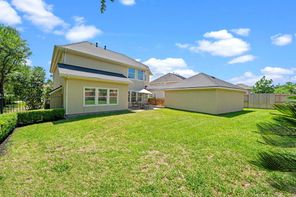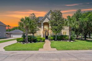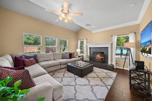 The roof was replaced in 2025. Spacious 5-bedroom, 3.5-bath home located in the gated community of Lakes of Buckingham Kelliwood. This well-maintained 2-story home offers a formal dining room and an open-concept layout with engineered Hickory wood flooring throughout most of the main living areas. The kitchen features granite countertops, a center island, gas cooktop, and ample cabinetry. The family room includes a gas-log fireplace and views of the backyard and lake. The first-floor primary suite includes a tray ceiling, large windows, walk-in closet, and an ensuite bath with separate vanities and jetted tub. Upstairs offers 4 large bedrooms, 2 full baths, and a spacious game room. Outside enjoy a private backyard with no back neighbors and a beautiful lake view with a lighted fountain visible from multiple rooms of the home. Surrounded by mature trees. 24 Hr. manned gated neighborhood.