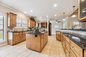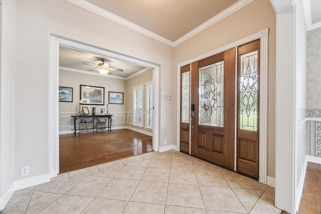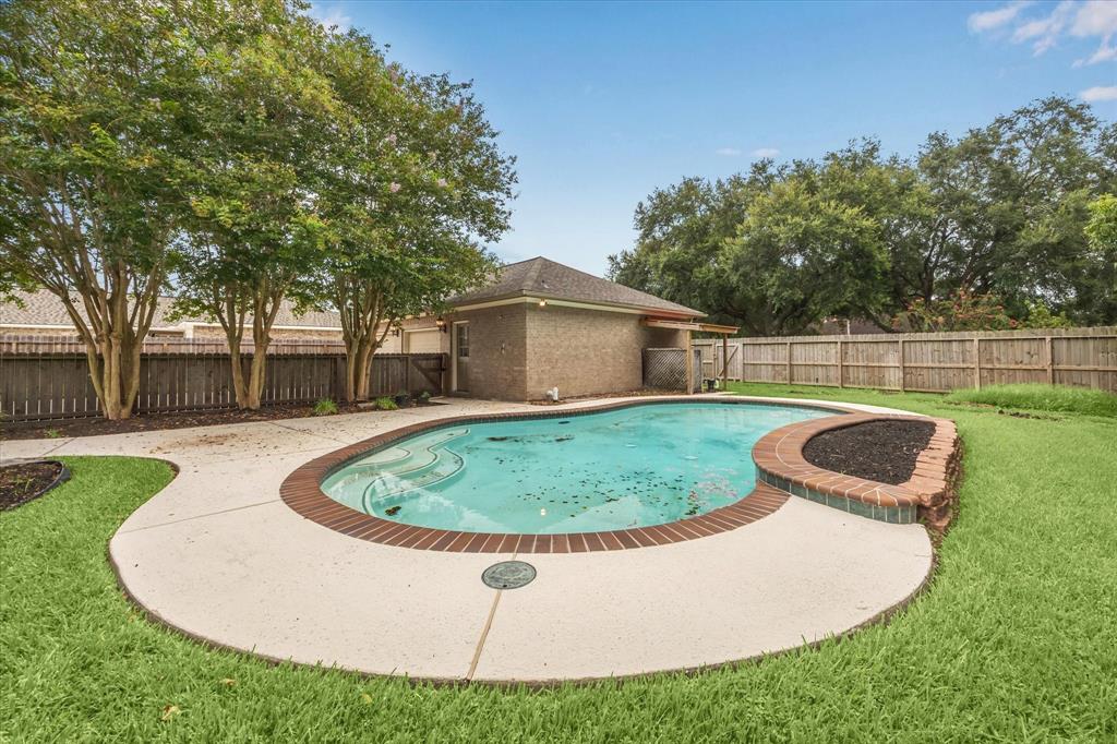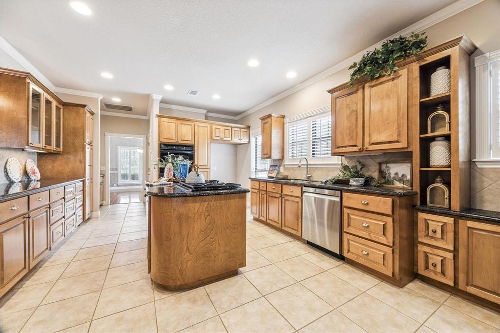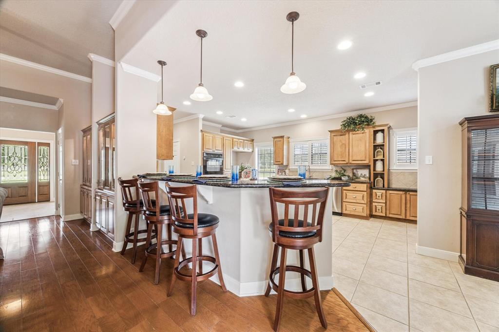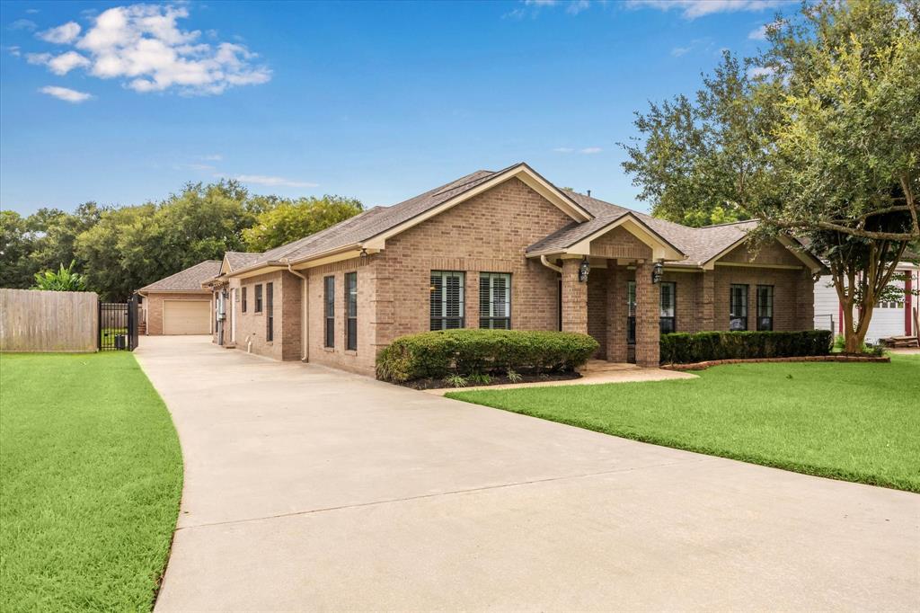 This true custom, one-owner home was crafted for everyday living and long-term value, offering over 3,200 sq ft of efficient single-story design in a small-town community with no HOA, no Mud Taxes, and no flooding history. Built with craftsmanship and efficiency in mind, it features a brand-new Windstorm Certified roof with transferable warranty, newer HVAC, newer water heater, and pool pump <1 yr old—major expenses already handled for you. A gated entry and curved drive lead to an oversized detached garage/workshop measuring 47’8” x 35’5”, complete with sink and A/C—perfect for vehicles, projects, and storage. Inside, hardwood floors, crown molding, plantation shutters, and custom cabinetry highlight timeless design. The gourmet kitchen offers granite counters, a commercial-grade gas range, double ovens, large island, and butler’s pantry. The expansive primary suite plus versatile rooms for office, crafts, or hobbies add flexibility. Outdoors, enjoy a covered patio and sparkling pool.