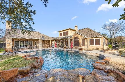 Tucked away on a quiet cul-de-sac street, this exceptional 5-bedroom, 5-full-bath + 2-half-bath home offers the perfect blend of luxury, comfort, & thoughtful design. With TWO PRIMARY SUITES —one up and one down—each with spa-style baths, dual vanities, and spacious closets, the layout is ideal for multi-generational living or long-term guests. The living room & private study showcase custom built-ins, while the chef’s kitchen features Taj Mahal quartzite counters, double ovens, pot filler, and beverage station with a wine fridge. A dedicated media room sets the stage for cozy movie nights, and the 815 sq ft (not included in 5296 sq ft) guest suite above the garage includes an oversized entertaining area and full bath. Outdoors, relax by the oversized resort-style pool and spa, surrounded by generous patio space and lush landscaping. A spacious 5-car tandem garage, roof replacement (June 2025), carpet replacement (2023), and impeccable one-owner care make this home truly unforgettable.