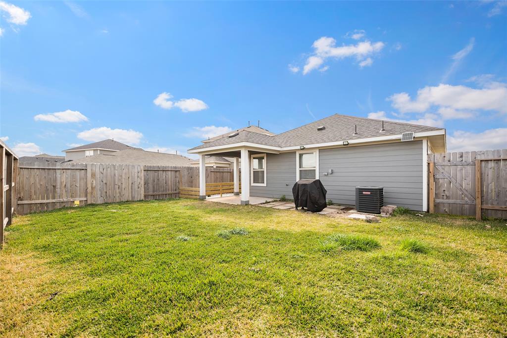 You are going to love living here. Well maintained, single story home boasts high ceilings, tile flooring, an open concept kitchen and living room areas. Plus an extended covered patio for outdoor entertaining. No neighbors behind. The oversized kitchen island is ideal to host all your family and friends! Beautiful, modern finishes such as granite countertops, a tile backsplash, and Whirlpool appliances. Unwind in the spa-like primary suite, complete with a walk-in closet, dual vanities, and an oversized shower. Super easy access to the Grand Parkway and major employment centers. Enjoy all the amenities of Lantana; walking and biking trails, a playground, and a splash pad.