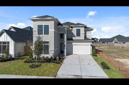 Coffered extended entry leads past game room to open kitchen, dining area and family room. Kitchen features deep walk-in pantry and generous island with built-in seating space. Dining area features curved wall of windows. Family room features wall of windows. Primary suite includes bedroom with wall of windows. Double doors lead to primary bath with dual vanity, garden tub, separate glass-enclosed shower and oversized walk-in closet. Abundant closet space and large windows add to this spacious four-bedroom design. Covered backyard patio. Mud room off two-car garage.