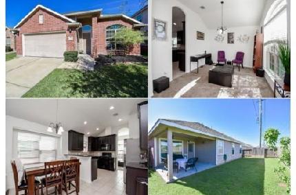 Beautiful and well-maintained one-story home in the desirable community of Ventana Lakes in Katy. This charming residence features 4 bedrooms, 2 baths. Open-concept layout with wood-look vinyl flooring throughout main areas and carpet in the bedroom for adding comfort. The kitchen in the center of the house is open to the living room and showcases white cabinets, white quartz countertops, and stainless-steel appliances. Refrigerator, washer, and dryer included. Covered patio and backyard, ideal for relaxing or entertaining. Zoned to the highly acclaimed Katy ISD and conveniently located near schools, grocery stores, restaurants, and much more. Easy access to Grand Parkway (99) and I-10. This community offers a central amenity center, resort-style pools with splash pads, a modern fitness center, and multiple playgrounds. Residents enjoy scenic, walkable lakes, extensive walking trails, picnic areas, and proximity to Katy ISD Schools.