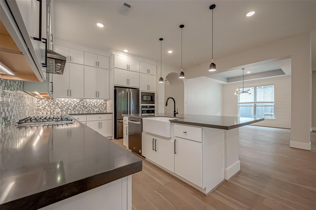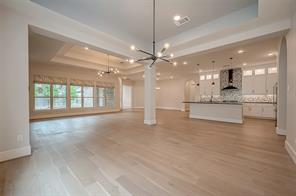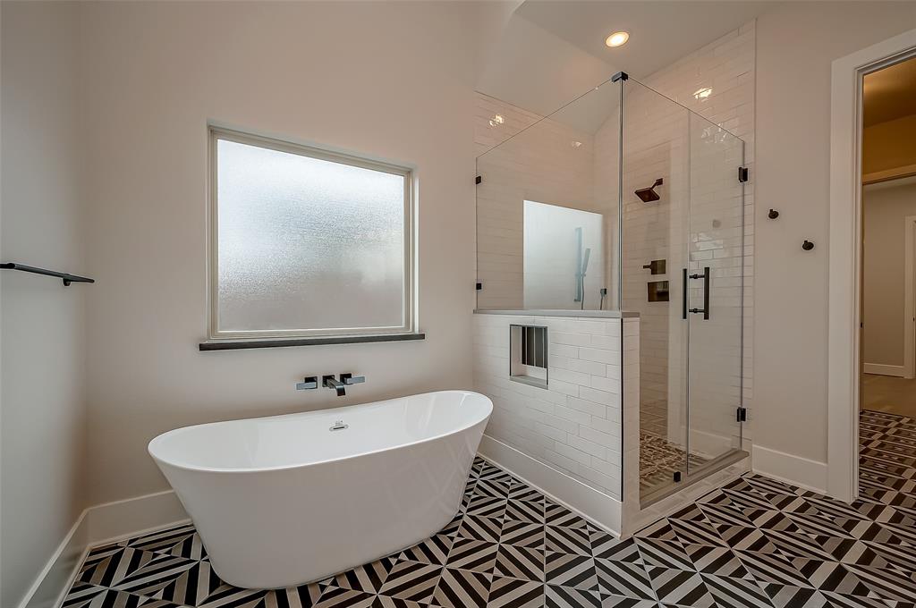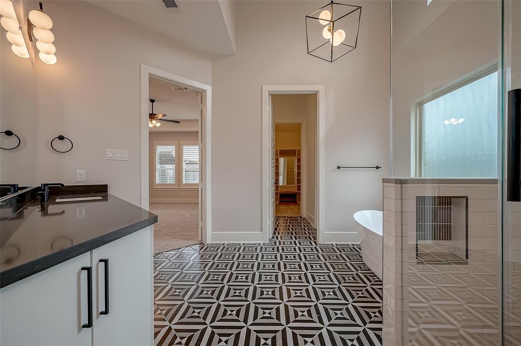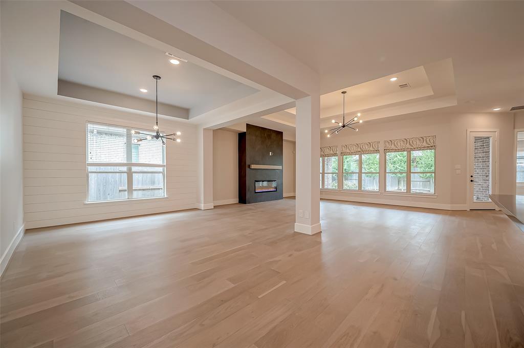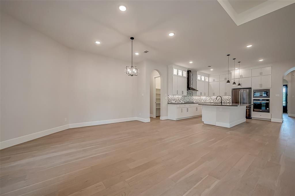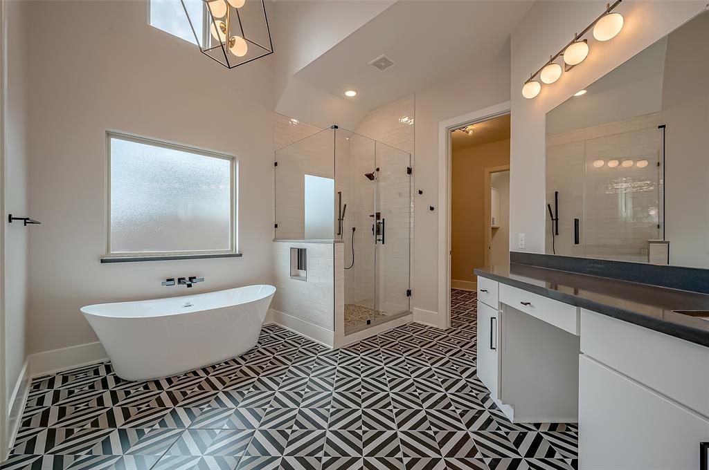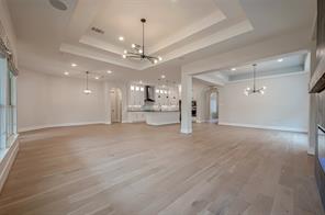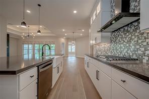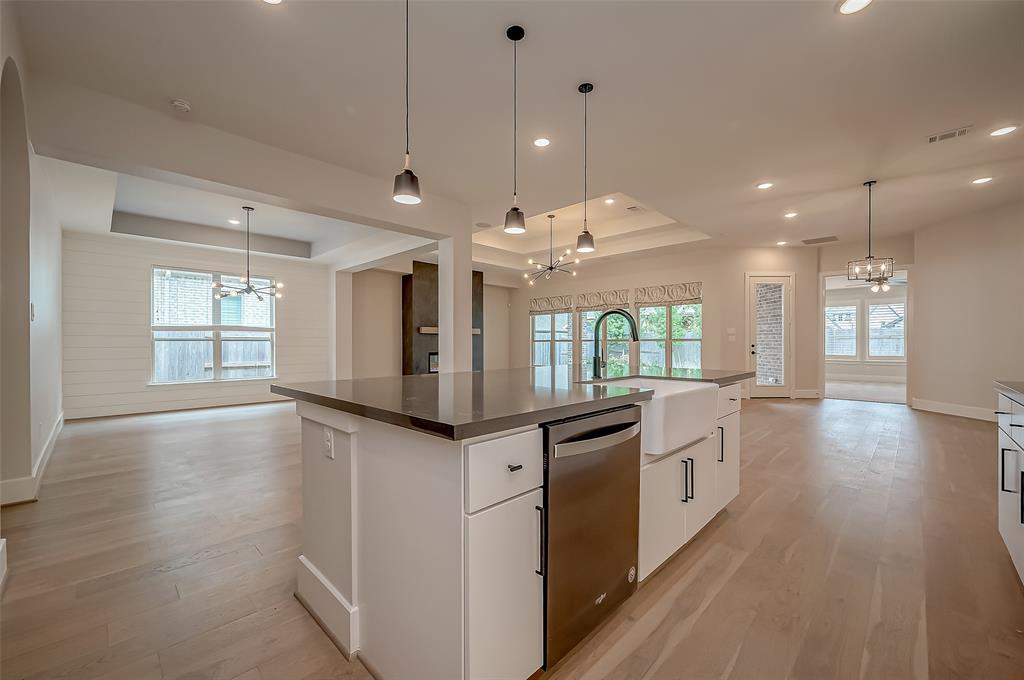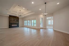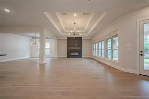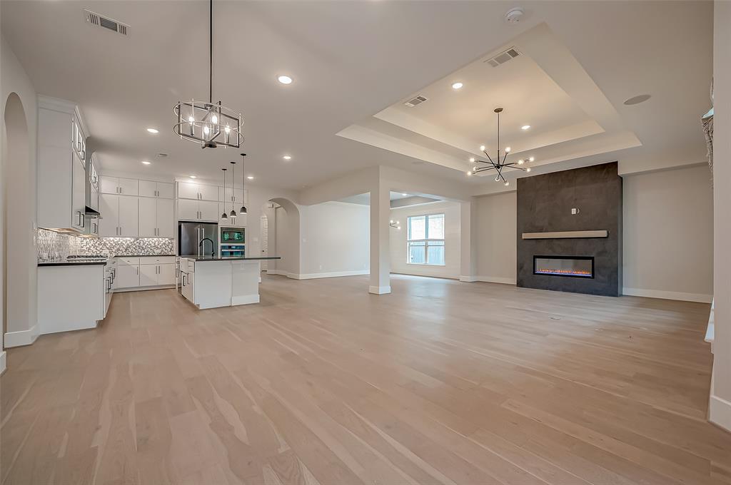 Step inside to find an elegant open-concept interior featuring modern design and architectural elements. The extensive light wooden flooring stretches across the entire area, providing a continuous, seamless look. The kitchen is a chef's dream, with sleek white cabinetry extending to the ceiling, a mosaic tile backsplash, and dark countertops that offer a striking contrast. The central island is both functional and stylish, complete with a built-in sink and modern pendant lights above. The dining and living areas are open and airy, thanks to high ceilings and recessed lighting. A coffered ceiling adds depth and architectural interest, highlighted by additional recessed lights and a stylish chandelier. The modern fireplace set within a dark, slate-like feature wall serves as a focal point, adding warmth and sophistication to the space. The primary bathroom features a freestanding white bathtub positioned beneath a large frosted window, providing both natural light and privacy.