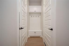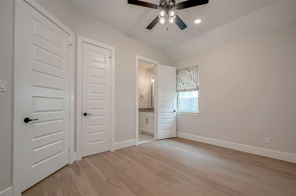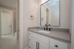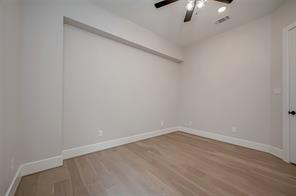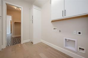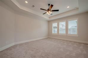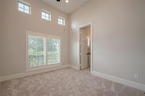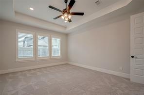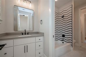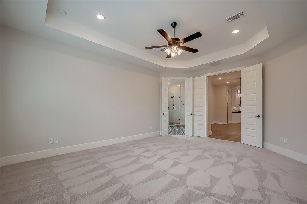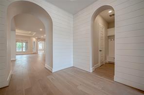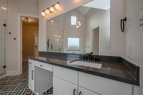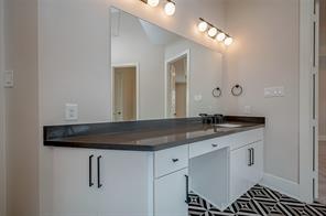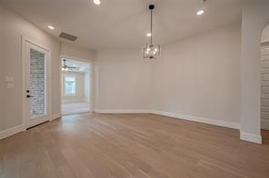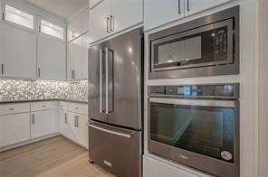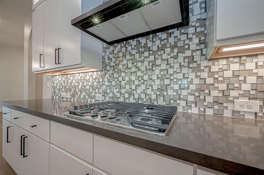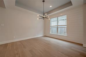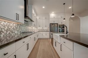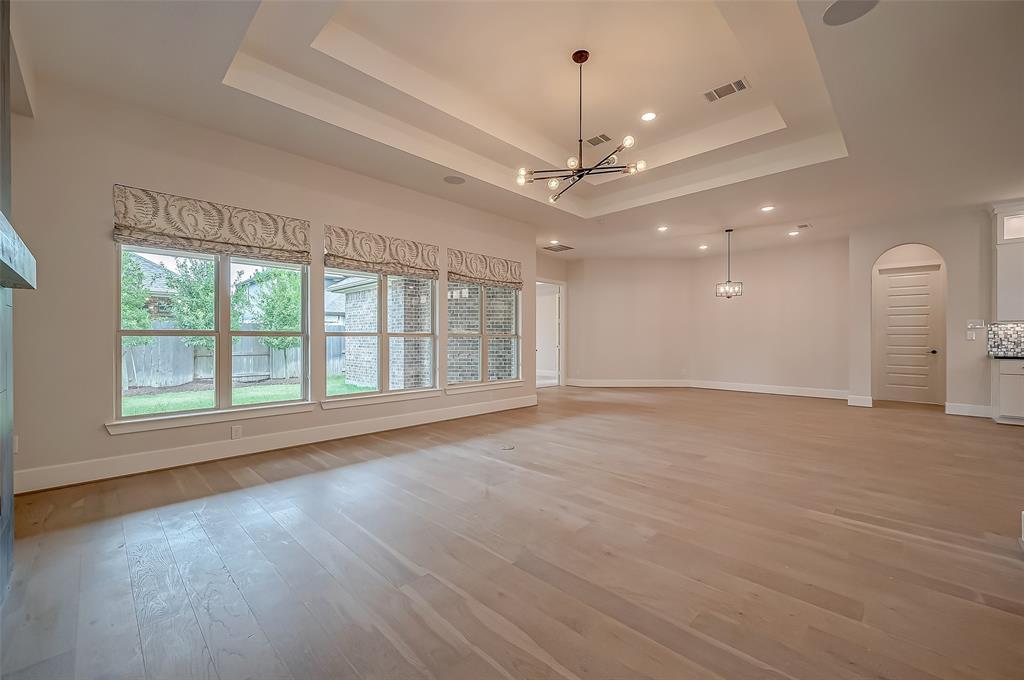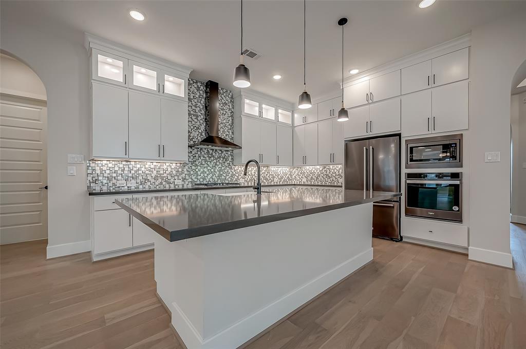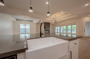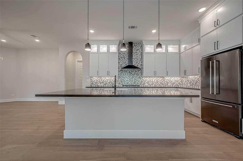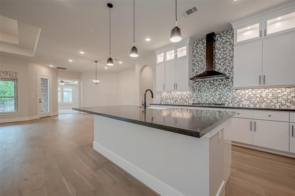 Step inside to find an elegant open-concept interior featuring modern design and architectural elements. The extensive light wooden flooring stretches across the entire area, providing a continuous, seamless look. The kitchen is a chef's dream, with sleek white cabinetry extending to the ceiling, a mosaic tile backsplash, and dark countertops that offer a striking contrast. The central island is both functional and stylish, complete with a built-in sink and modern pendant lights above. The dining and living areas are open and airy, thanks to high ceilings and recessed lighting. A coffered ceiling adds depth and architectural interest, highlighted by additional recessed lights and a stylish chandelier. The modern fireplace set within a dark, slate-like feature wall serves as a focal point, adding warmth and sophistication to the space. The primary bathroom features a freestanding white bathtub positioned beneath a large frosted window, providing both natural light and privacy.