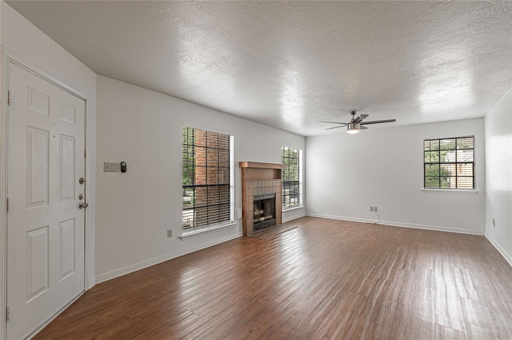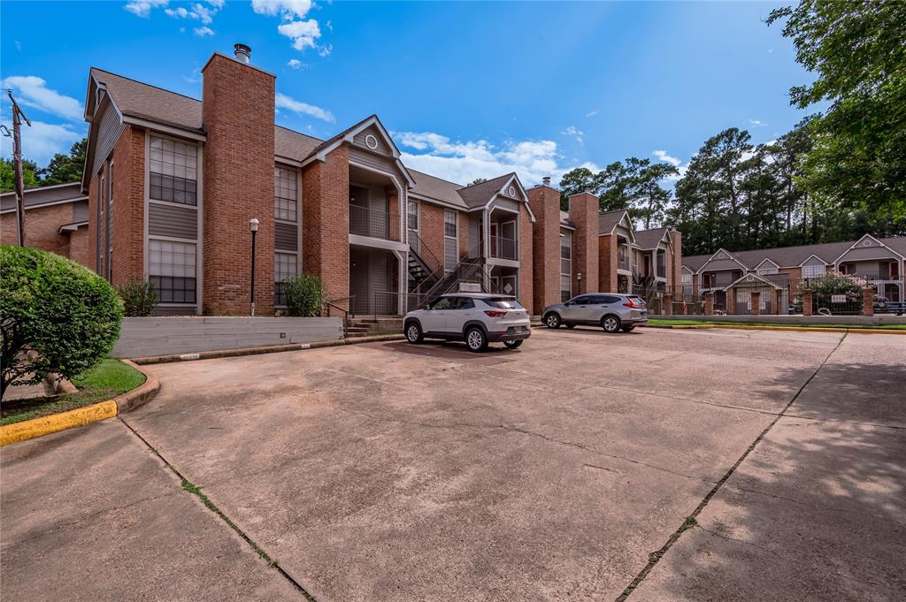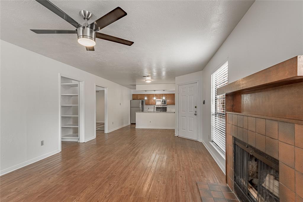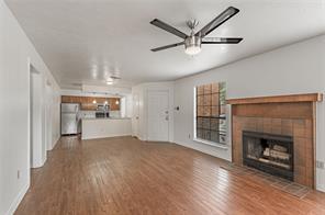 This ground floor corner unit includes stone counters, modern appliances including stack washer & dryer, refrigerator, stove, and microwave. Living area features a wood burning fireplace. Two bedrooms with ensuite bathroom access. Lots of windows throughout provide natural light.