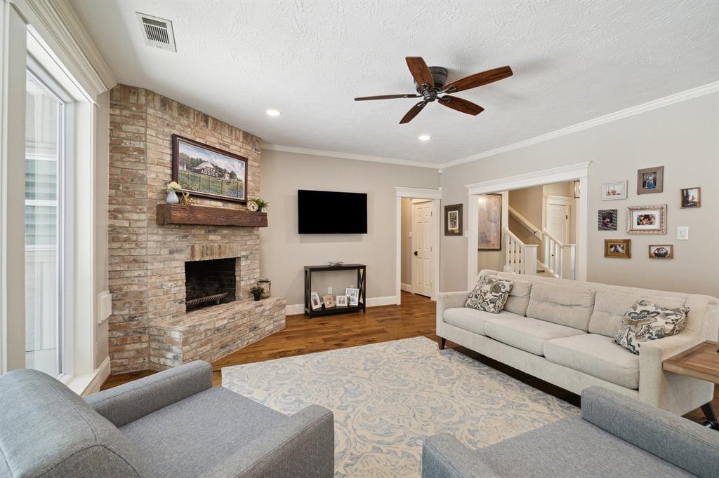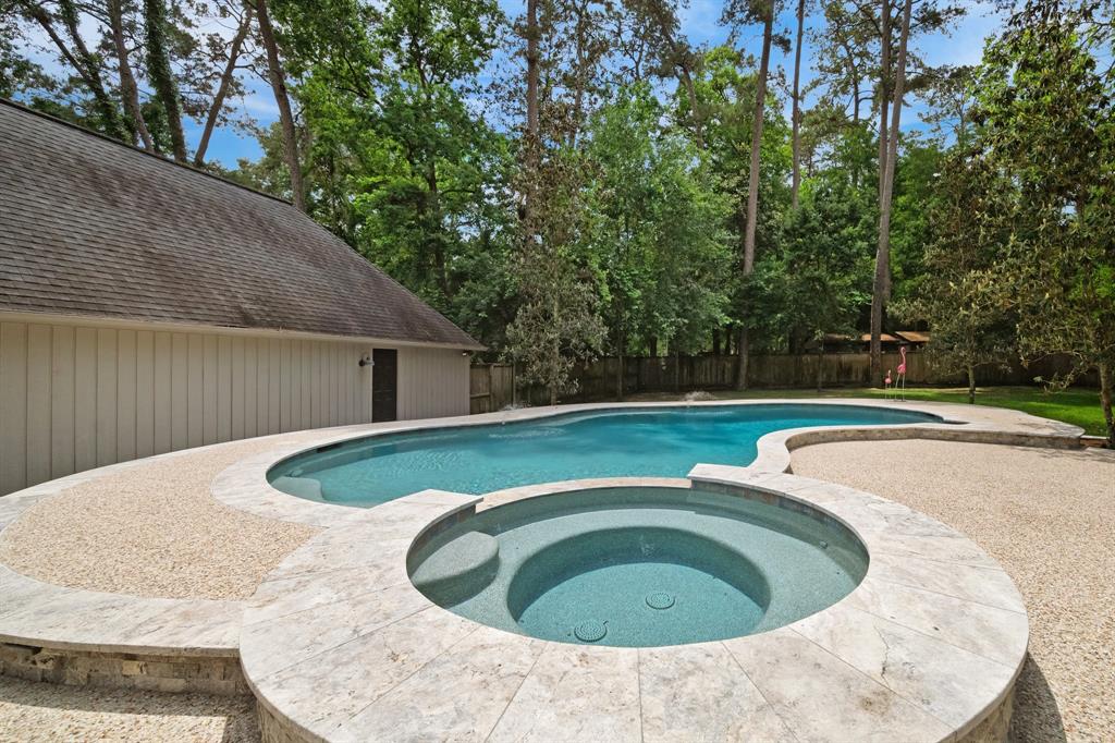 Pristine custom home on nearly acre lot in Kings Forest. Completely updated top to bottom! This gorgeous home boasts private study that could also be formal dining. Kitchen is chef' delight with custom-built cabinets, large Island with quartz counters, commerical grade stainless appliances and open to spacious den. Stunning wood floors throughout. Large downstairs gameroom with kitchenette and large mud room opens to pool! Primary suite features sitting room/study and 2 large closets. Primary bath has seamless glass shower and soaking tub with door access to pool area. Upstairs features additional gameroom, 3 bedrooms and 2 baths. Covered back patio. Pool showcases terraced stacked stone and beautiful surround. Large private lot with mature trees. 3 car garage and extra parking. One of the best homes in Kingwood!