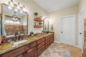 Don't miss this chance in the sought-after Estates of Clear Creek! This custom one-story home sits on a spacious four-acre lot with a manicured front yard, private pond, fenced backyard, and wooded area. The kitchen boasts granite countertops, custom cabinets, and a gas cooktop. Enjoy the family room's wood-burning fireplace and stone hearth. The primary suite features tile floors, en-suite bath with double sinks, separate shower, and soaking tub, plus a large closet. Each secondary bedroom has its private bath, ideal for multi-generational living. A large utility room, covered back porch with fireplace, and a 40 x 60 garage complete this lovely property. Schedule your showing today!!
