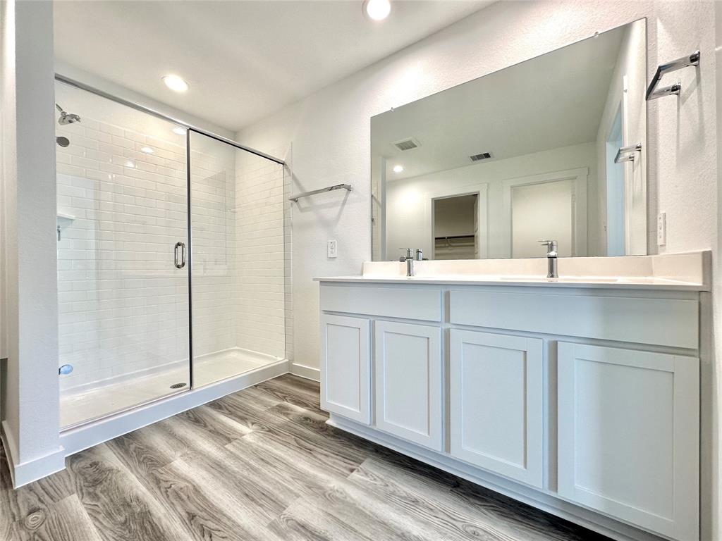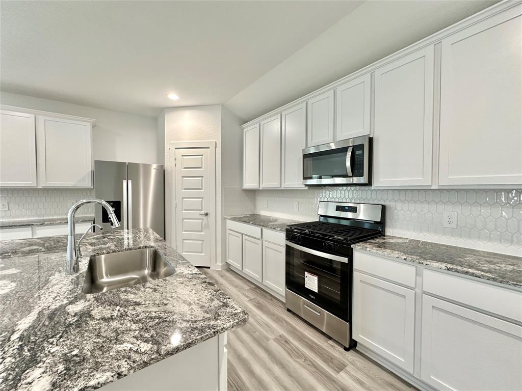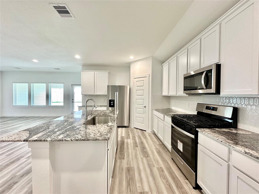 Timeless Amazing Brick & Stone Elevation! 5 Bedrooms! 3 Bathrooms! Grand Entering W/High Ceilings & Beautiful Luxury Vinyl Plank Floors throughout the Common Areas! Gourmet Kitchen W/Ultra-Modern Tall Shaker Cabinets, Stunning Silestone Quartz Counters, Huge Eat-in Island, Deep Under-mount Stainless Sink, Dupure Water Filtration System, Whirlpool Stainless Appliances! Family Room has a Wall of Windows Looking Out to the Covered Patio! Casual Dining & Gourmet Kitchen all flow in Family Rm! Private Owners Suite W/Spa-Like Bathroom, His & Her Shaker Cabinets, Cultured Marble Vanity, Huge Seamless Glass Shower for 2 W/Tile Surroundings & Walk-in Closet! Guest Bedrooms private & tucked away! Your own Office/Study Room! Energy Saving-Energy Star Rated, Tankless Heater.