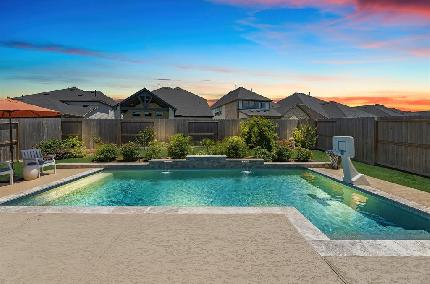 *FEATURES CATERING KITCHEN* Tri Pointe Homes Downy floorplan is a modern two-story with a stone and stucco exterior with front porch, and a grand 8-foot entry door. Upon entering the home, you are greeted by an airy foyer featuring double-height 20-foot ceilings and interior 8-foot doors, creating a sense of grandeur and openness. The main floor boasts an open floor plan that connects the living room, dining area, and kitchen with built-in appliances. This home creates visual interest in the living area with a curved staircase, oversized windows, and an open view from the game room to the downstairs area. Well-appointed bedrooms are located on the first floor: the secondary bedroom and bath with a walk-in shower only, and the primary bedroom with a luxury ensuite bath featuring a stand-alone tub The second floor has two additional bedrooms, a game room, and a dedicated media room. The media room has prewiring for four speakers and a subwoofer, perfect for a full cinematic experience.