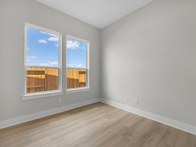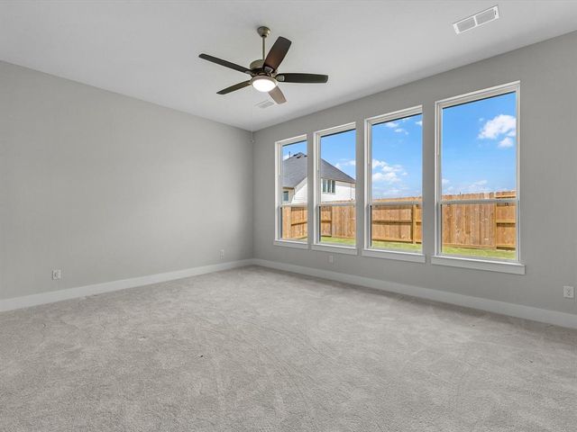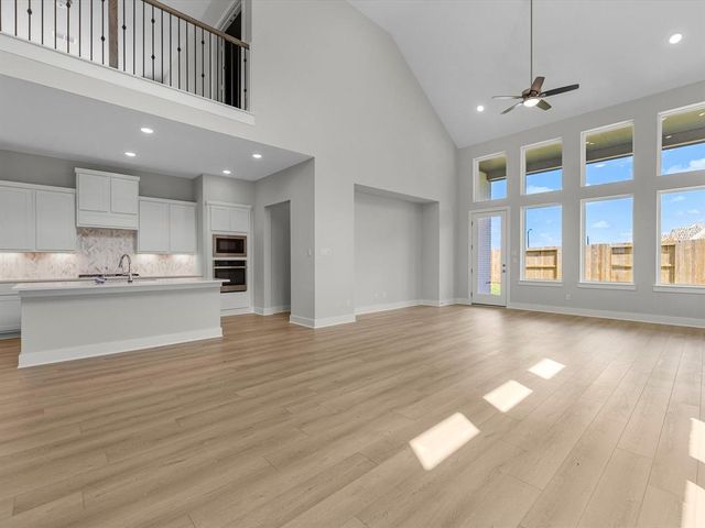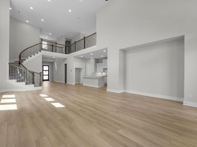 CUL- DE-SAC HOMESITE - Tri Pointe Homes Downy floorplan is a modern two-story with a stone and stucco exterior and a grand 8-foot entry door. Upon entering the home, you are greeted by an airy foyer featuring double-height 20-foot ceilings and interior 8-foot doors, creating a sense of grandeur and openness. The main floor boasts an open floor plan that connects the living room, dining area, and kitchen with built-in appliances. This home creates visual interest in the living area with a curved staircase, oversized windows, and open view from the game room to the downstairs area. Well-appointed bedrooms are located on the first floor: the secondary bedroom and bath with a walk-in shower only and the primary bedroom with a luxury ensuite bath featuring a stand-alone tub. The second floor has two additional bedrooms, game room, and dedicated media room. The media room has prewiring for four speakers and a subwoofer. The Downy floor plan combines modern comfort and welcoming residence.