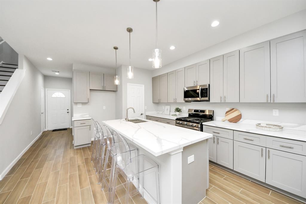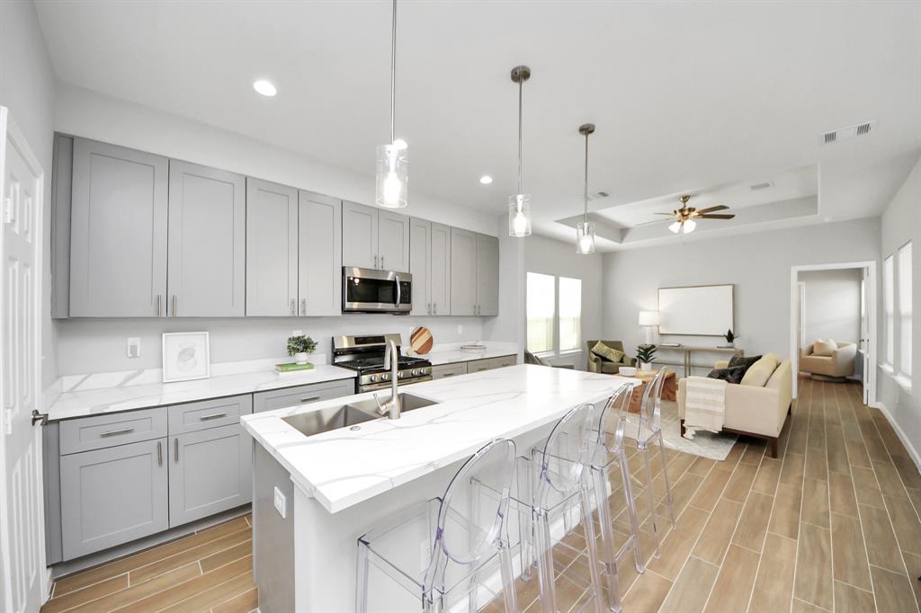 Step inside this beautiful, newly constructed home with 3 bedrooms and 2.5 bathrooms. The open floorplan is perfect for hosting friends and family, with features like Quartz countertops, a 9-foot kitchen island, and recessed and pendant lighting. Upstairs, you'll find engineered wood flooring and a possible small game room. The laundry room is conveniently located upstairs, and the home boasts 9-foot ceilings throughout. The primary bedroom and living area have elegant trimmed ceilings, and the primary bathroom includes a double vanity and walk-in closet. The kitchen is equipped with 42-inch soft closing cabinets, making it a dream to cook in. Welcome home!