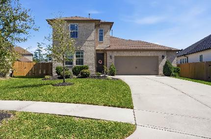 Magnificent one-story home in the sought after Estates of Legends Trace on a quiet cul-de-sac. This 4-bedroom, 3-bath home + private study features high ceilings with an amazing split floor plan for everyday living. A major upgrade includes a NEW 6/2025 ROOF, providing buyers peace of mind. The foyer has tray ceilings, designer lighting, and flows into the large kitchen & breakfast area open to the family room with a gas log fireplace, creating a comfortable space for entertaining. The primary suite at the back features tray ceilings, dual vanities, a soaking tub, separate shower, and generous his & her walk in closets. A secondary bedroom with ensuite bath is at the front, ideal for guests or multigenerational living. There are two additional bedrooms & a full bath. Enjoy a manicured backyard with lush landscaping and large covered patio for outdoor gatherings. Zoned to Conroe ISD with convenient access to Grand Parkway 99, Hardy Toll Road, shopping, dining, The Woodlands, and IAH.