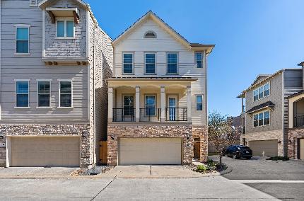 Unique, contemporary two-story townhome featuring a fenced front yard—perfect for pets—and an exceptional courtyard-facing location with pergolas just beyond the front door. The front entry welcomes abundant morning light, filling the first-floor living & dining areas through expansive windows. Twelve-foot ceilings and real wood floors on the first level enhance the sense of elegance. Enjoy tranquil park views from both the living room and the primary bedroom, with immediate access to green space right outside. The kitchen is beautifully appointed with Bosch appliances, furniture-grade cabinetry, soft-close doors and hinges, and generous storage, including an oversized island with six dedicated pots-and-pans drawers. The spacious primary suite easily accommodates a sitting area and multiple furniture pieces, offering a true retreat. The spa-inspired bath features a six-foot soaking tub and seated shower, while the oversized walk-in closet provides ample space for clothing and shoes!