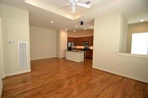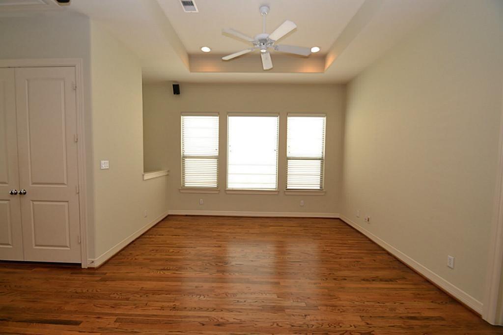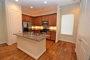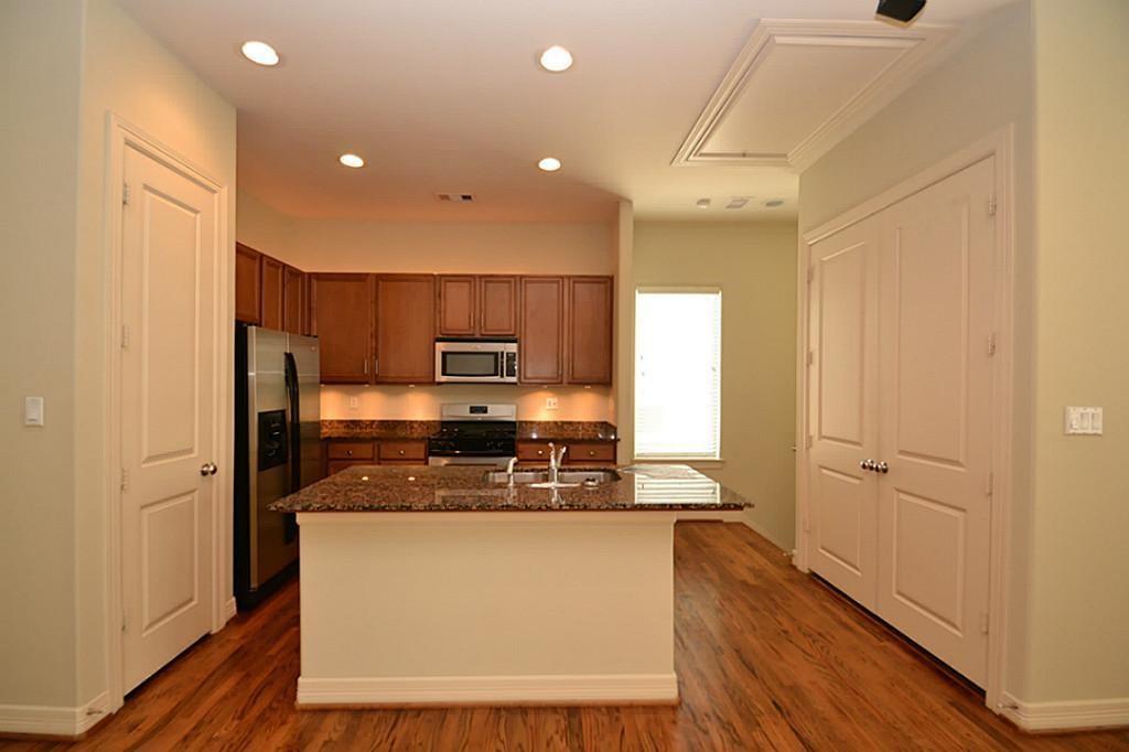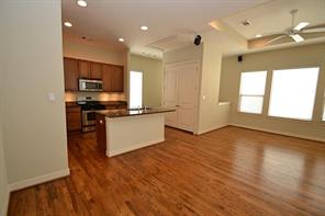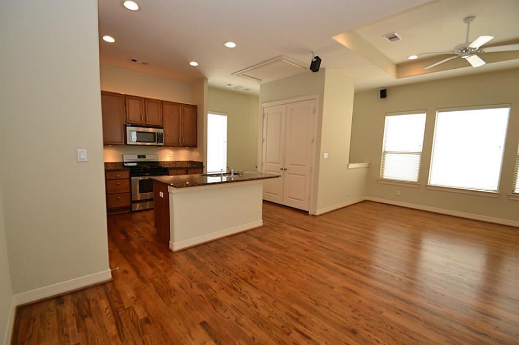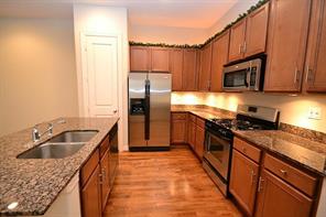 Beautiful two-story end unit townhome with custom finishes including granite counter tops in both kitchen and both baths, under cabinet adjustable lighting in kitchen, ceiling fan in primary bedroom and family room. Beautiful hardwood floors in kitchen/family/breakfast room and stairway. Special features include high ceiling, picture windows, ceramic tile in baths and an excellent location within walking distance to many restaurants and shops. Home includes refrigerator, full size washer and dryer.