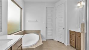 READY FOR MOVE-IN! Home office with French doors and formal dining room set at two-story entry. Kitchen and morning area open to two-story family room with wall of windows. Kitchen features corner walk-in pantry, 5-burner gas cooktop and generous island with built-in seating space. First-floor primary suite. Dual vanity, garden tub, separate glass-enclosed shower and large walk-in closet in primary bath. A second bedroom is downstairs. Upstairs features a game room and two secondary bedrooms. Extended covered backyard patio. Mud room off two-car garage.