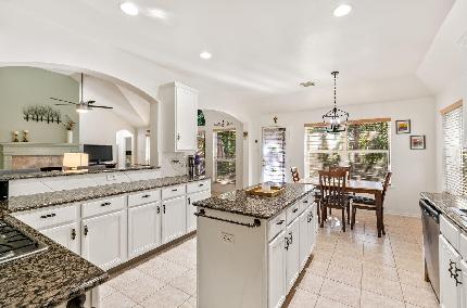 This beautifully updated residence, features a large, welcoming front porch, perfect for morning coffee or evening relaxation. Upon entry, you'll find a versatile room perfect for an office or bedroom to the left, with privacy double doors and formal living and dining areas to the right. The first hall leads to two secondary bedrooms, a full bath and the utility room, with easy access to the garage. Straight ahead, the foyer opens into an expansive, open-concept living area showcasing soaring ceilings, a cozy fireplace and an open kitchen with large quartz, leather finished counter tops w a large walk-in pantry. The kitchen also host new stainless steel appliances, with a double country drop-in sink and a coffee bar. The breakfast room adjoins the kitchen and has a double window seat for added charm. The primary suite is tucked just off the family room and features designer wall treatment with a large onsite bath and large closet. This move-in-ready home will go quickly!