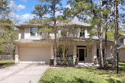 Charming home in the desirable Alden Bridge Village of The Woodlands offering 5 bedrooms and 4 baths. Light-filled interiors feature plantation shutters, a spacious family room with an 18-foot vaulted ceiling, gas fireplace, and a wall of windows, plus an island kitchen with Cambria Quartz counters, travertine tile backsplash, and double-door pantry. The first floor includes a private guest suite with full bath and a secluded owners retreat with engineered wood floors, soaking tub, and separate shower. Upstairs you will find a loft-style gameroom and three secondary bedrooms with two additional baths. The backyard is a true retreat with a pool, spa, and no back neighbors, backing to a wooded greenbelt. Walking distance to a neighborhood park and exemplary Buckalew Elementary, zoned to The Woodlands High School, and minutes from premier shopping and dining.