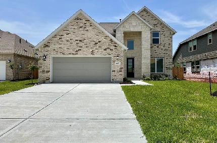 Welcome to this newly constructed beautiful 4 bed, 3 bath lakefront home in the Westwood community! Step inside to a grand foyer with soaring ceilings, leading to an open-concept family room with high ceilings and expansive windows overlooking the serene lake. The main floor includes the master suite with dual vanities, an oversized shower and a soaking tub, plus a second bedroom and full bath. The kitchen and all bathrooms are finished with elegant quartz countertops, adding a touch of sophistication throughout. Upstairs are two additional bedrooms, a third full bathroom, a spacious game room, and a media room—perfect for family fun and entertaining. Refrigerator, washer, dryer, and sprinkler system included. Relax or entertain on the large, covered patio with gas hookup overlooking the lake. Gate in the backyard leads to walking/biking trails. Community offers pool, splash pad, clubhouse, parks, and playgrounds. Zoned to highly rated Clear Creek ISD. Ready for move-in!