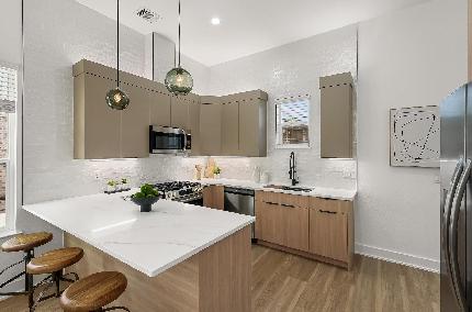 Experience contemporary modern living near Oak Forest and The Heights in this stylish three-story rental. This home features 3 bedrooms, each with a private full bath, plus a convenient half bath for guests. The main living area offers an open layout with great natural light, a spacious dining area, and a sleek kitchen with quartz counters, modern cabinetry, and a striking island. Durable wide-plank flooring extends through all levels—no carpet anywhere. The first-floor bedroom works well for guests or a home office. Upstairs, the third-floor primary bedroom suite includes a generous bath with a separate tub and shower, dual sinks, and a walk-in closet. A secondary suite and laundry area complete the top floor. Located in a small gated community with guest parking, this home offers comfort, modern finishes, and easy access to nearby dining, parks, and amenities. Perfect blend of comfort, style, and convenience. Welcome home!