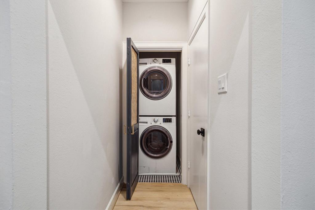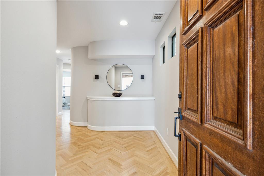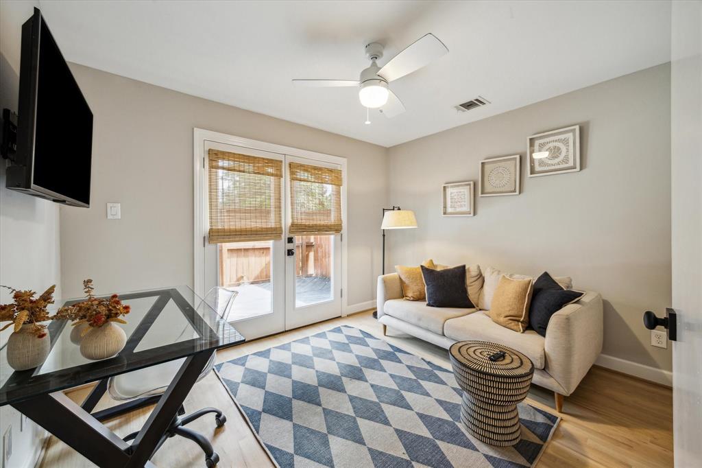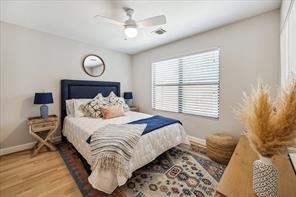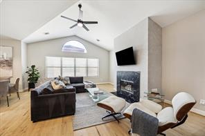 This updated 3 bedroom 2 & ½ bath freestanding patio home is located in a well-established gated community in Garden Oaks. Attractive entry with hardwood floors in a herringbone pattern. Two bedrooms on level one share a hall bath. Back outdoor patio access with a nice deck. A bar area downstairs with an undercounter fridge serves the patio. Upstairs to the Great Room with a fireplace and a soaring vaulted ceiling. The kitchen with stainless appliances opens to the dining room all with hardwood floors. Formal powder bath. The primary bedroom on this same level has a coffered ceiling and views. The refreshed primary bath has plaster-finished walls, a micro cement finished double sink with storage, frameless shower surround and a large walk-in closet with built ins. All appliances including washer and dryer will convey. Two car attached garage with cabinet storage. A fine move in ready home in a nice neighborhood!