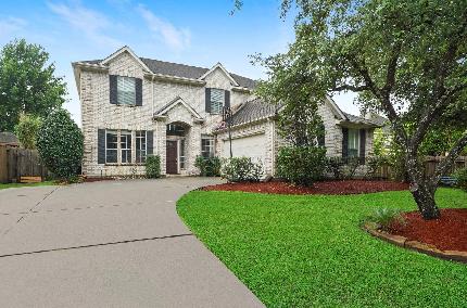 Stunning all brick one story backing to a private greenbelt, wrought iron fence and an enlarged covered patio. This home boasts of wide plank hardwood floors in family room, dining, one bedroom and hallway, soaring ceilings, crown molding, walls of windows, gas fireplace, 3 car tandem garage, split plan, alarm, sprinkler and more. The island kitchen has stainless appliances, natural 42 inch cabinets, quartz countertops, tile backsplash, breakfast bar, expansive cabinets, and opens to the breakfast and family rooms. The primary bedroom has a sitting room, vaulted ceiling, huge walk in closet, and bath with jetted tub, separate shower, double sinks, vanity and is light and bright. The split plan with generously sized rooms is great. This well maintained home has a one year old roof. Windrose is a master planned community with golf course, golf clubhouse, 2 pools, lighted tennis courts, pickle ball courts, trails, lake, and parks scattered throughout.