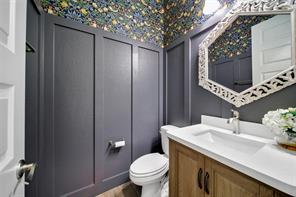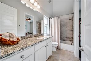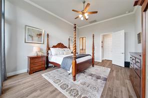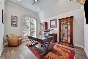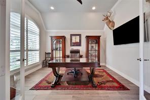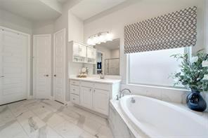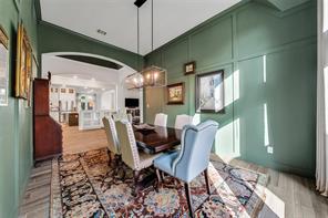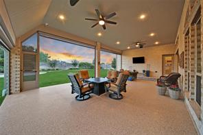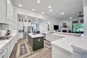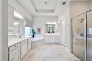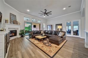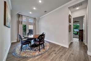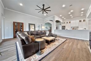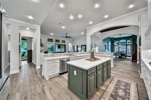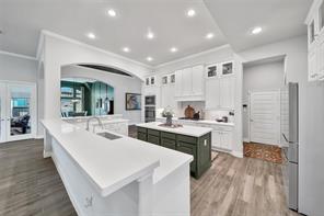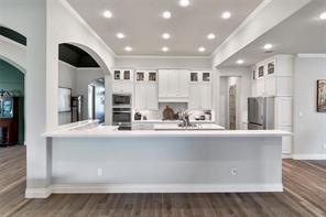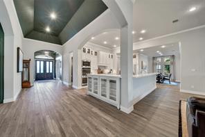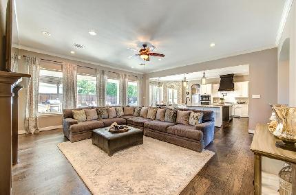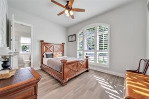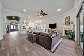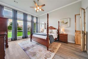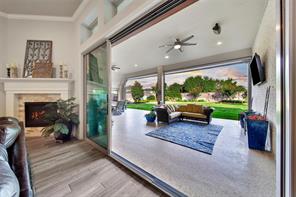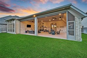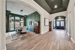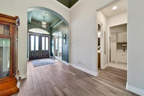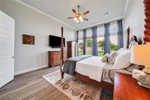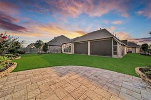 Stunningly 4-bedroom, 3.5-bath home that blends timeless elegance with modern luxury. Boasting high ceilings, offering a spacious, open Concept, enhancing the architectural detail. Beautifully designed interior, featuring all tile flooring, the board and batten accents add a touch of farmhouse charm. Gourmet kitchen is a chef’s dream, w/double smart ovens, soft-close drawers, a reverse osmosis system, and under and top cabinet lighting. The sliding glass doors lead to a spacious, epoxy-coated extended patio with electric shades, ceiling fans, and a built-in gas hookup. Master suite features blackout shades, crown moulding, and antique wood doors leading to a spa-like bath with 2 custom walk-in closets with built-in cabinetry. Other highlights include TV/media room, surround sound, 4-car garage w/epoxy flooring, built-in storage, and floored attic access, professional landscaping, with accent lighting in the f/b yards and in the eaves, plus gutters integrated into a drainage system.