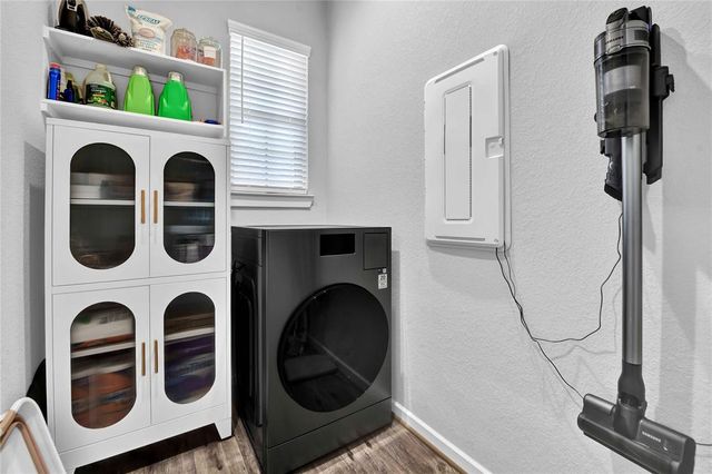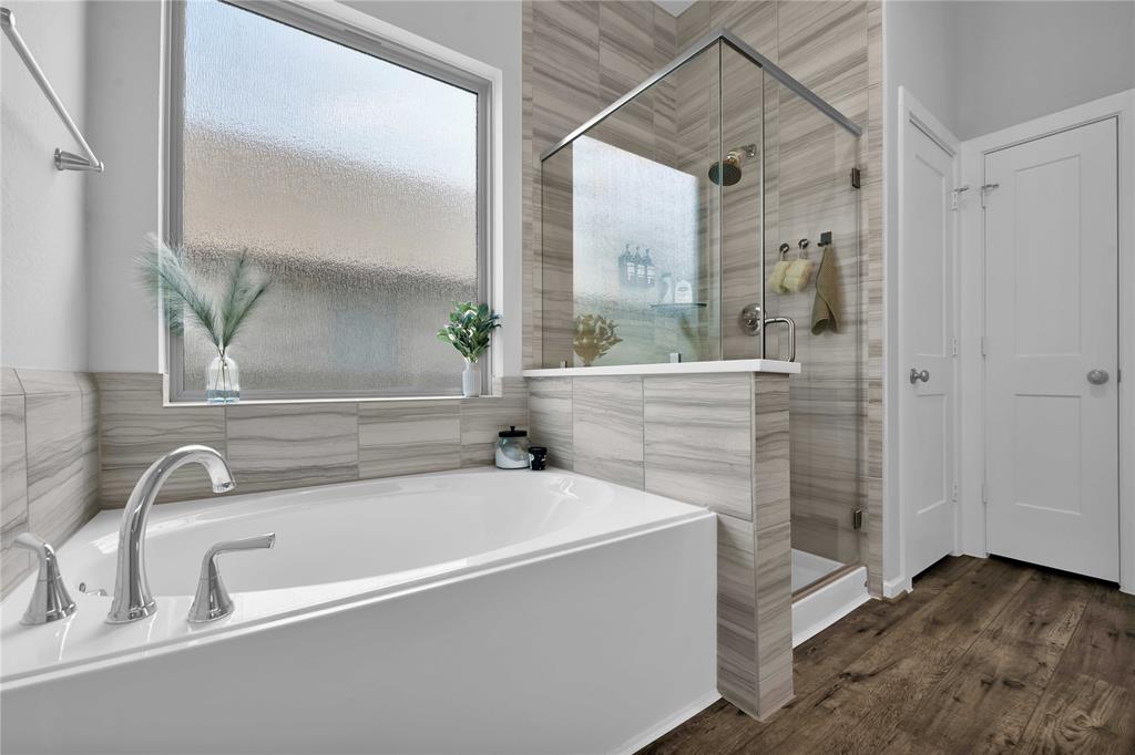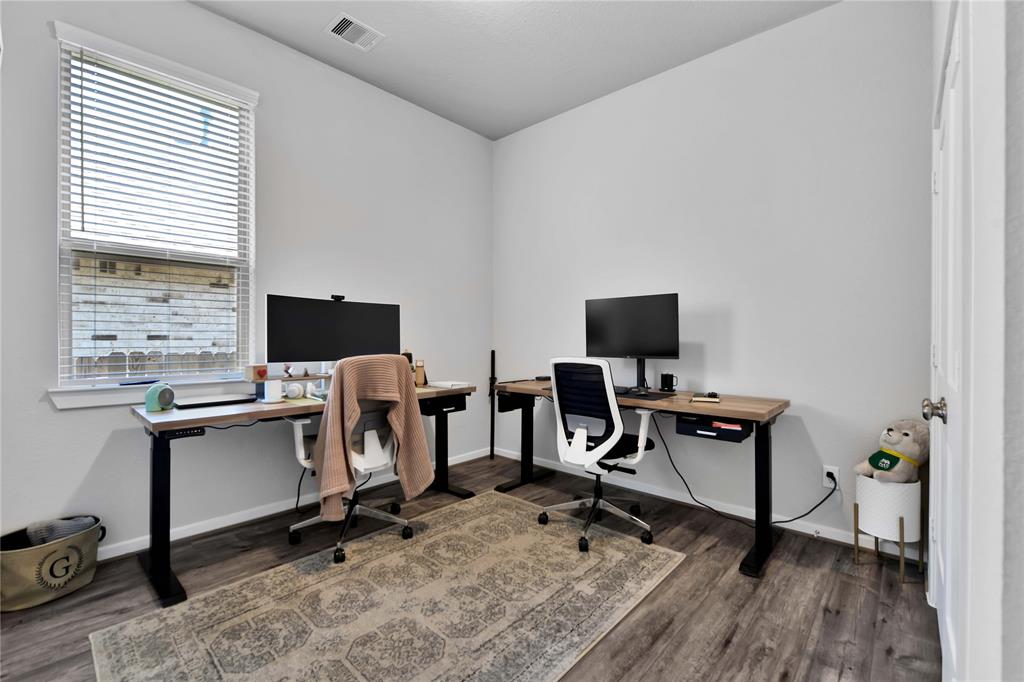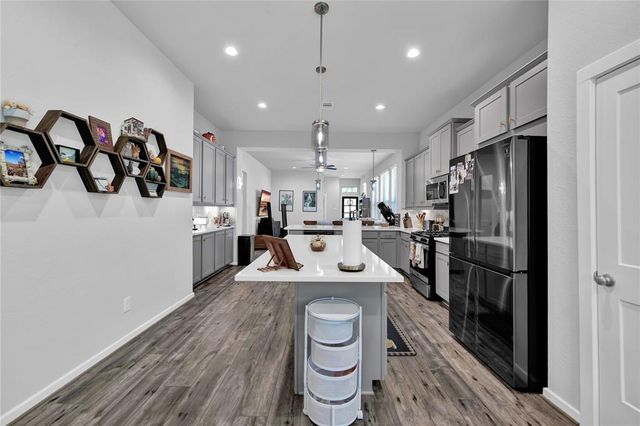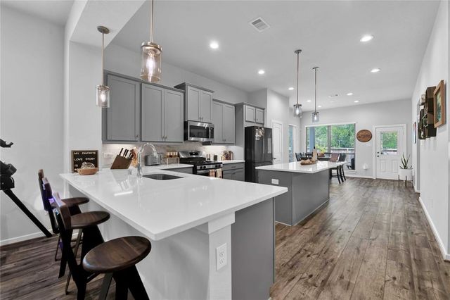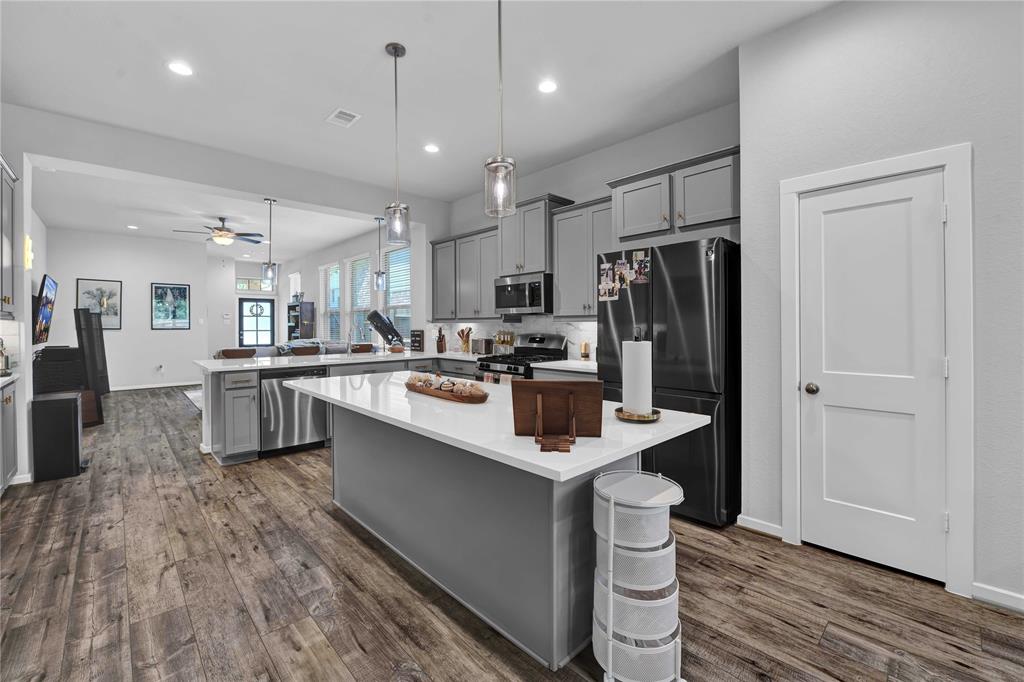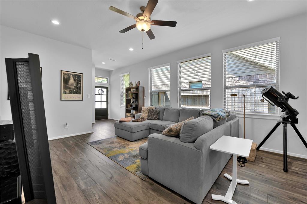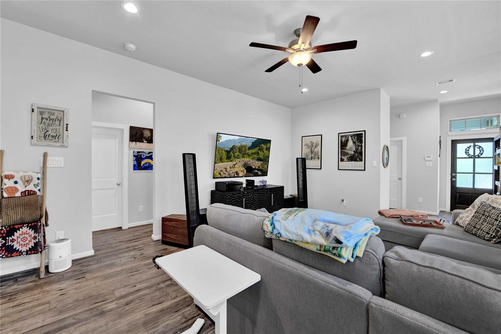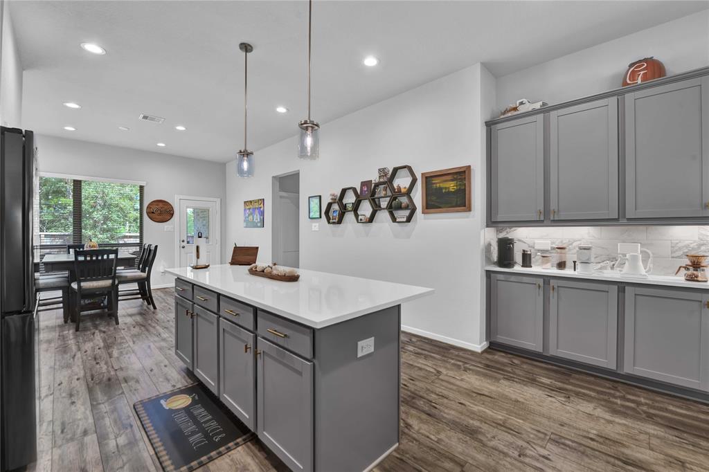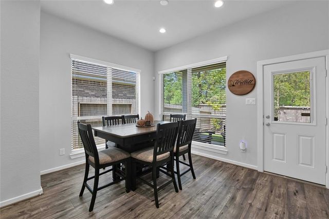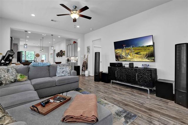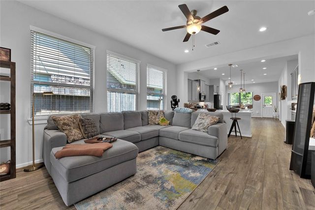 Welcome Home to The Woodlands Hills! Did not lose power during hurricane Beryl! This beautiful like new one-story three bedroom two bath home has no rear neighbors and is conveniently located with quick access to I-45, HWY 105 and lots of shopping and dining! The open floor plan with vinyl plank floors throughout allows for easy entertainment with the kitchens large island and peninsula counter opening up to the family room. The backyard provides a covered patio and great sized yard. The primary en-suite is located at the back of the home for privacy with the primary suite offering a large soaking tub, separate shower and walk-in closet. The washer/dryer combo machine is included. Take advantage of the community amenities recreational center w/ resort style pools & splash pad, fitness center, tennis courts, dog park, and walking/biking trails. Schedule a private tour today!