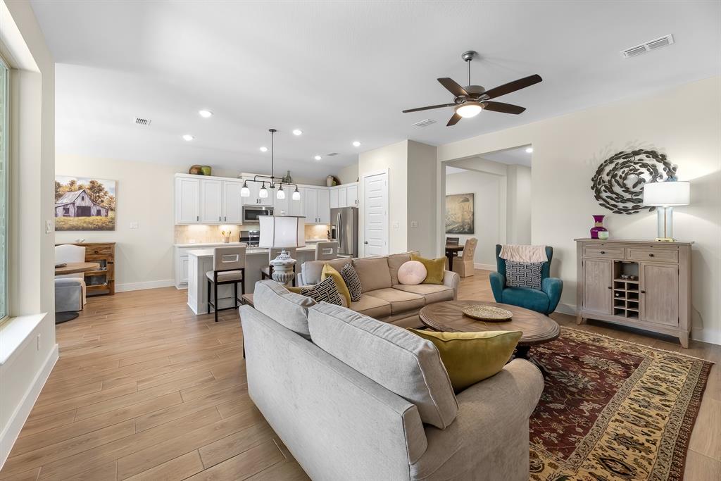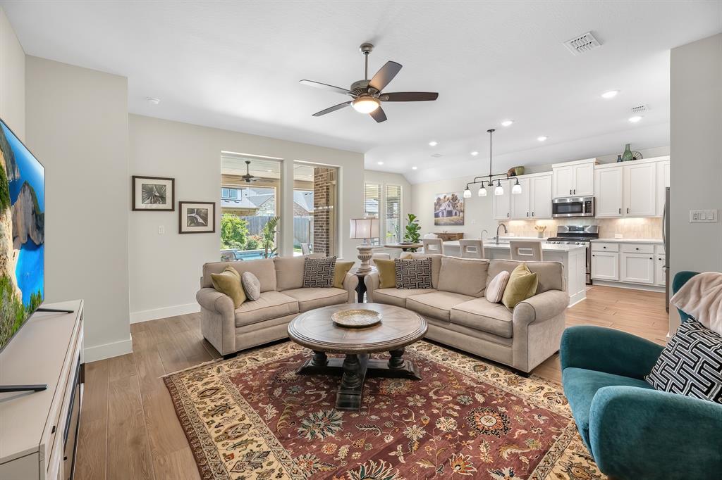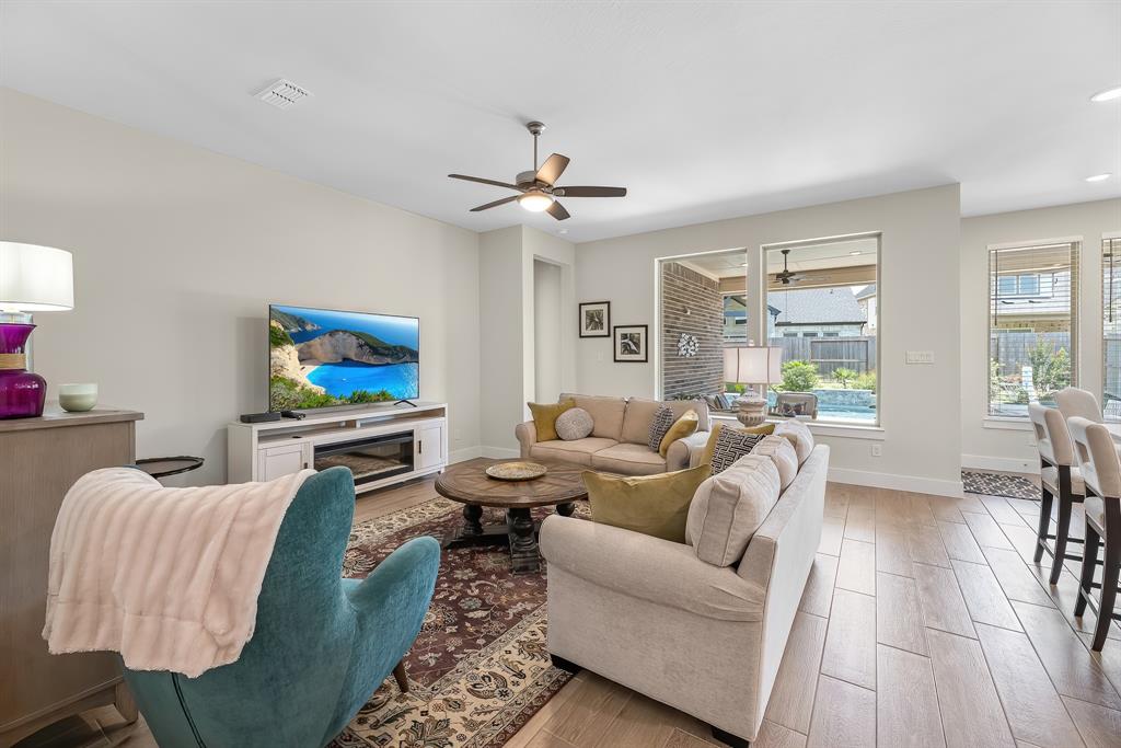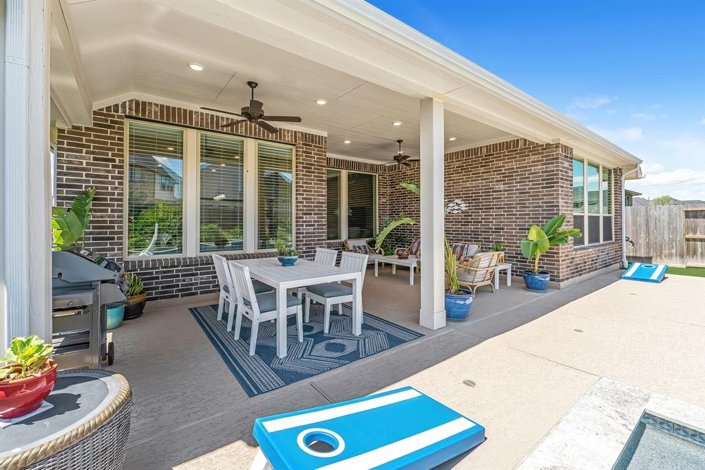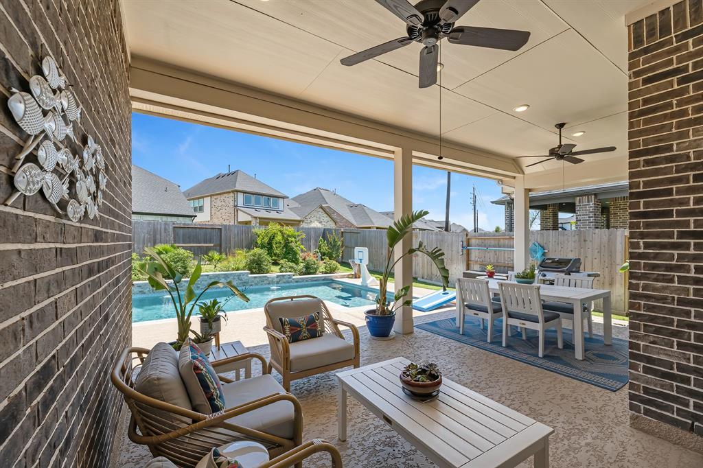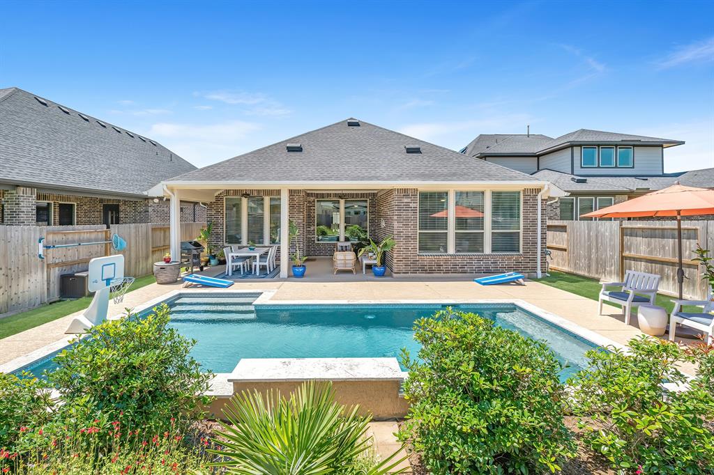 Live the resort lifestyle every day! This STUNNING 1-story Tri Pointe gem in Fulshear, built in 2023, offers style and comfort with a beautiful brick front, 3-4BR/2.5BATHS, resort-style pool, and K5 Infinity Water System. Flooded with natural light, this home features a flexible open layout, wood-plank tile floors, soaring ceilings & 8ft doors. TWO secondary rooms plus oversized flex room offers space for entertainment, hobbies, or convert to a 4th bedroom. The bright family room showcases incredible views of the backyard retreat and spacious patio. The gourmet kitchen is packed with modern upgrades—quartz island, white cabinets, and a sunny breakfast nook. The luxurious primary suite features a spa-inspired shower, double sinks, and elegant Grey Wolf cabinetry. Step outside to enjoy a massive covered patio and newer PebbleTec pool—ideal for entertaining or unwinding. Community perks include a gym, trails, lakes, and an amenity center—all within walking or biking distance!