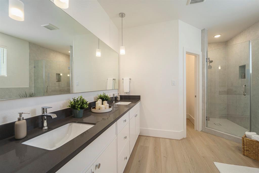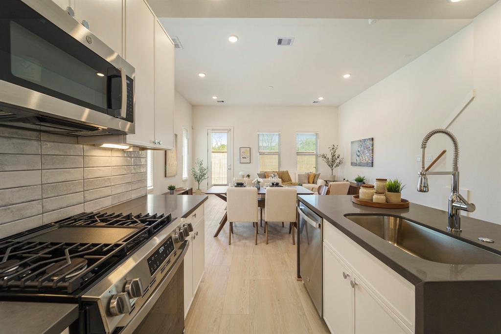 Welcome to this stunning, new modern home perfectly located in a vibrant community near parks, schools, and plenty of shopping and dining options. From the moment you step inside, you'll love the bright, airy feel created by higher ceilings and a spacious open floor plan. The living area flows effortlessly into the beautifully designed kitchen, featuring stainless steel appliances, pristine white cabinets, a striking island with bar seating, and a gorgeous tile backsplash. A cozy dining area completes the main floor. Upstairs, the primary suite is ready to impress with tall ceilings, a luxurious ensuite bath with dual sinks, a large walk-in shower, a soaking tub, and an expansive walk-in closet. 2 additional bedrooms offer flexibility for every lifestyle. Outside, enjoy a fully fenced backyard with green space—perfect for relaxing or entertaining. With modern finishes and nothing left to do but unpack, this home is the easy choice for buyers seeking style and comfort!