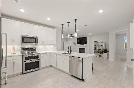 This open-concept design features 10' ceilings and white-plank luxury vinyl flooring throughout the home. The dine-in kitchen is equipped with stainless steel appliances, quartz countertops, European-style cabinetry and select plumbing fixtures. Sliding glass door opens to a private porch and yard with no back door neighbors. The expansive primary suite boasts large windows, dual vanities, a freestanding soaking tub, a glass-enclosed shower and a spacious walk-in closet with built ins. Two additional en-suite bedrooms each with walk-in closets and tub/shower combinations.