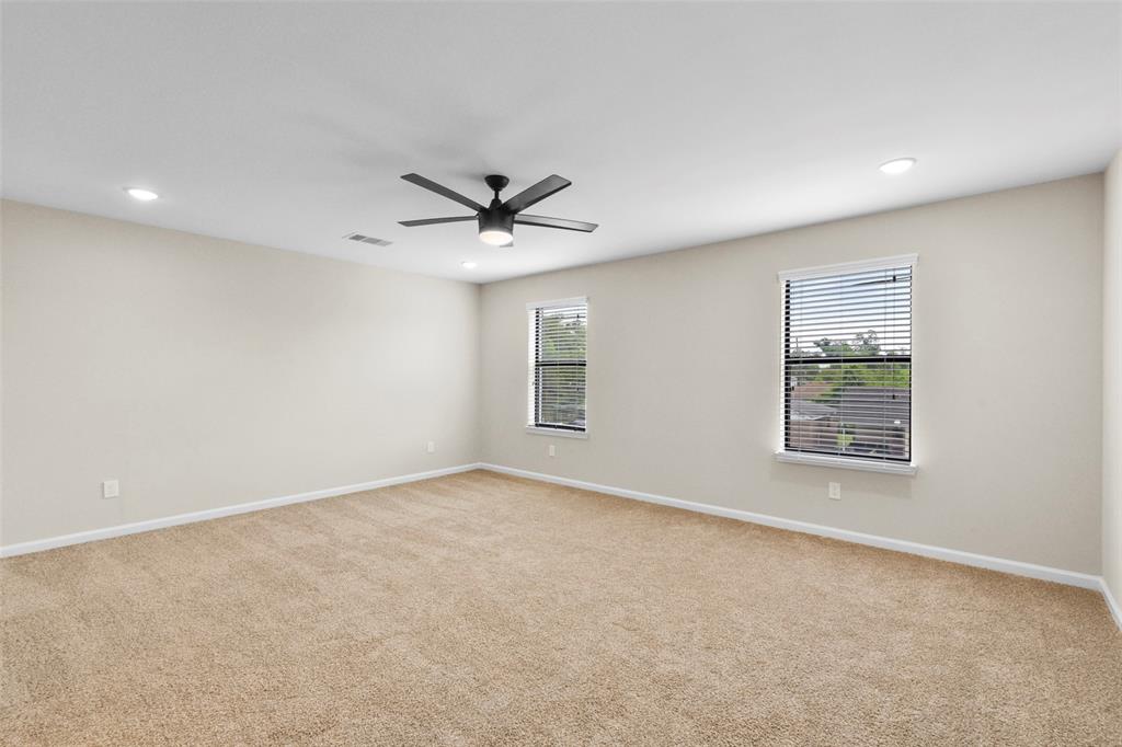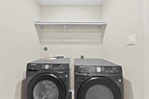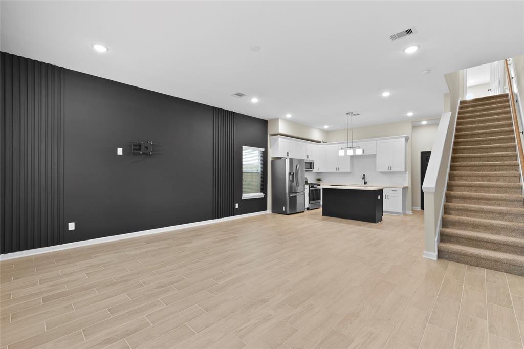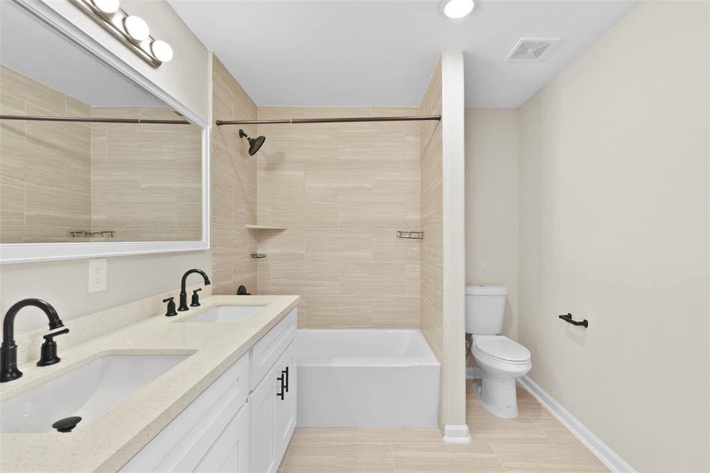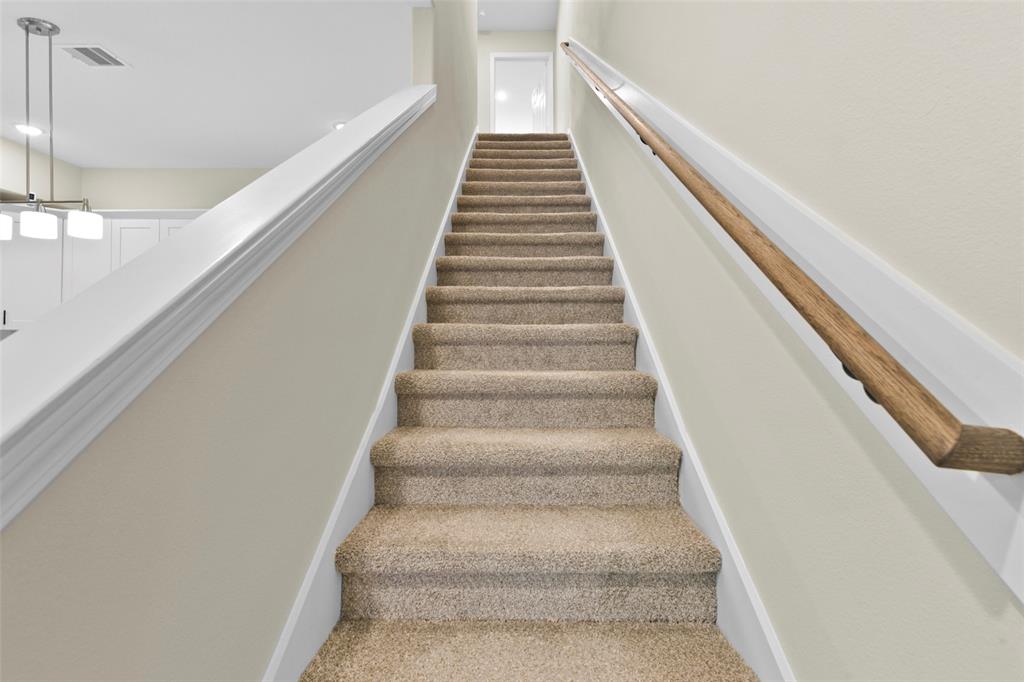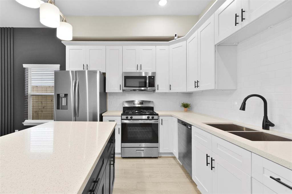 Welcome to your new home! This stylish 3-bedroom, 2.5-bathroom two-story rental features a smart layout and high-end finishes throughout. Downstairs offers a convenient half bath and an open-concept living area with no carpet, a dark gray accent wall, and a mounted TV. The modern kitchen shines with white cabinets, black hardware, stainless steel appliances, and recessed lighting. Upstairs, all bedrooms have plush carpet and ceiling fans. The spacious primary suite includes a mounted TV, double vanity, and walk-in closet. A full-size Samsung washer and dryer are located in the second-floor laundry room. With a two-car garage and thoughtful upgrades, this move-in-ready home has everything you need.