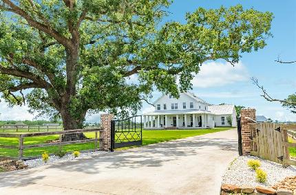 This modern farmhouse features white board and batten paired with modern white brick. Sherwin-Williams Smokehouse accents the columns, truss, garage, and front door, with a black shingle roof and white-trimmed windows. The kitchen overlooks the lake through three windows above the apron-front workstation sink, topped with sconces and set in a fully tiled wall. A 10-ft quartz island anchors the space, joined by a gas cooktop and wall oven/microwave combo. Side bar is perfect as a coffee or baking center. Cabinets reach the 9-ft ceiling. Focal point of this large open space will be a cast stone surround fireplace with built-ins on either side. Dual vanities feature signature hair/linen storage, and the large closet includes built-ins with laundry room access. Laundry room offers abundant cabinetry, counters, a workstation sink, a cleaning product closet, and a custom laundry basket sorter, with space for a second fridge. Large windows frame views of the oversized porch and lake beyond.